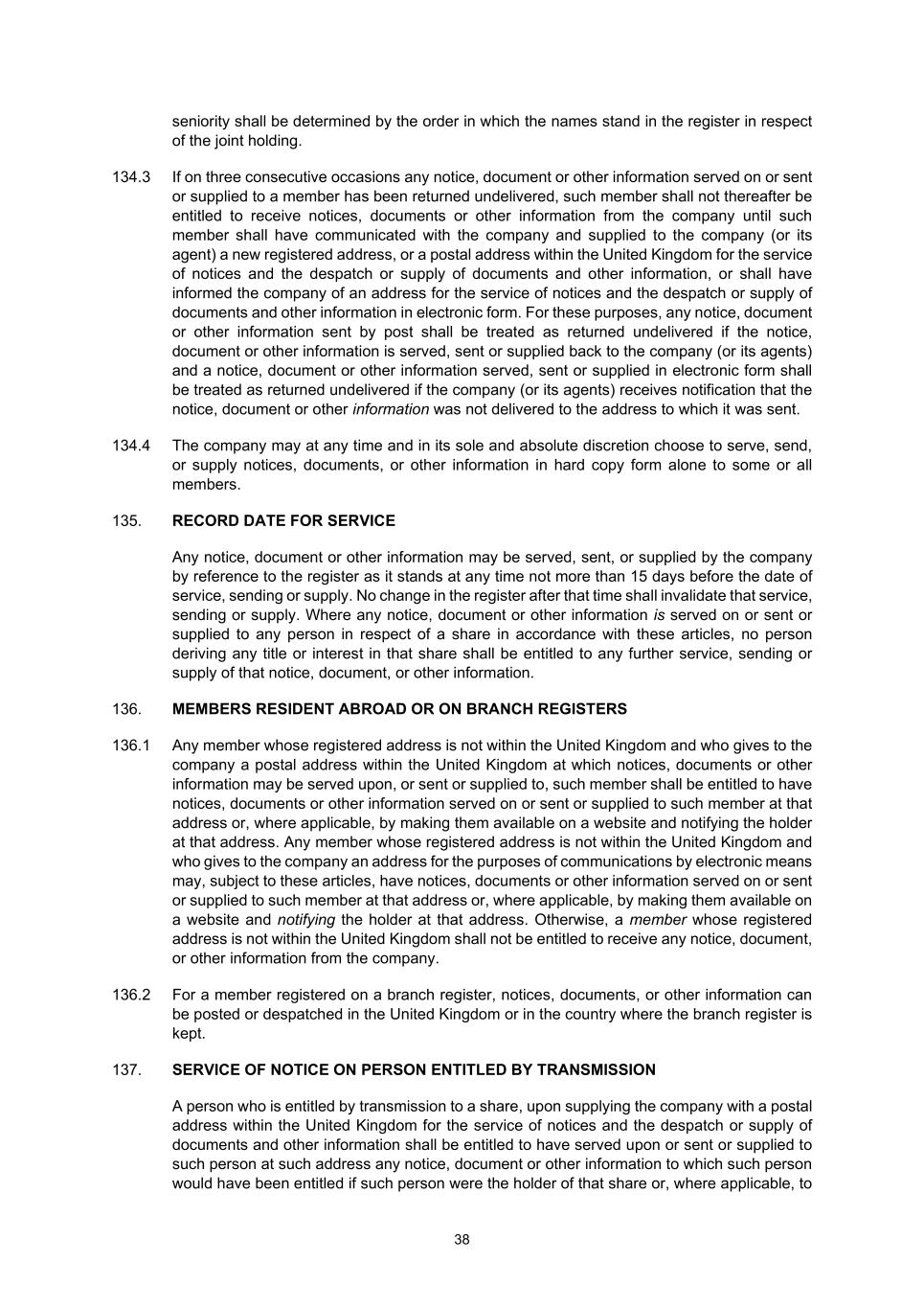 38 seniority shall be determined by the order in which the names stand in the register in respect of the joint holding. 134.3 If on three consecutive occasions any notice, document or other information served on or sent or supplied to a member has been returned undelivered, such member shall not thereafter be entitled to receive notices, documents or other information from the company until such member shall have communicated with the company and supplied to the company (or its agent) a new registered address, or a postal address within the United Kingdom for the service of notices and the despatch or supply of documents and other information, or shall have informed the company of an address for the service of notices and the despatch or supply of documents and other information in electronic form. For these purposes, any notice, document or other information sent by post shall be treated as returned undelivered if the notice, document or other information is served, sent or supplied back to the company (or its agents) and a notice, document or other information served, sent or supplied in electronic form shall be treated as returned undelivered if the company (or its agents) receives notification that the notice, document or other information was not delivered to the address to which it was sent. 134.4 The company may at any time and in its sole and absolute discretion choose to serve, send, or supply notices, documents, or other information in hard copy form alone to some or all members. 135. RECORD DATE FOR SERVICE Any notice, document or other information may be served, sent, or supplied by the company by reference to the register as it stands at any time not more than 15 days before the date of service, sending or supply. No change in the register after that time shall invalidate that service, sending or supply. Where any notice, document or other information is served on or sent or supplied to any person in respect of a share in accordance with these articles, no person deriving any title or interest in that share shall be entitled to any further service, sending or supply of that notice, document, or other information. 136. MEMBERS RESIDENT ABROAD OR ON BRANCH REGISTERS 136.1 Any member whose registered address is not within the United Kingdom and who gives to the company a postal address within the United Kingdom at which notices, documents or other information may be served upon, or sent or supplied to, such member shall be entitled to have notices, documents or other information served on or sent or supplied to such member at that address or, where applicable, by making them available on a website and notifying the holder at that address. Any member whose registered address is not within the United Kingdom and who gives to the company an address for the purposes of communications by electronic means may, subject to these articles, have notices, documents or other information served on or sent or supplied to such member at that address or, where applicable, by making them available on a website and notifying the holder at that address. Otherwise, a member whose registered address is not within the United Kingdom shall not be entitled to receive any notice, document, or other information from the company. 136.2 For a member registered on a branch register, notices, documents, or other information can be posted or despatched in the United Kingdom or in the country where the branch register is kept. 137. SERVICE OF NOTICE ON PERSON ENTITLED BY TRANSMISSION A person who is entitled by transmission to a share, upon supplying the company with a postal address within the United Kingdom for the service of notices and the despatch or supply of documents and other information shall be entitled to have served upon or sent or supplied to such person at such address any notice, document or other information to which such person would have been entitled if such person were the holder of that share or, where applicable, to