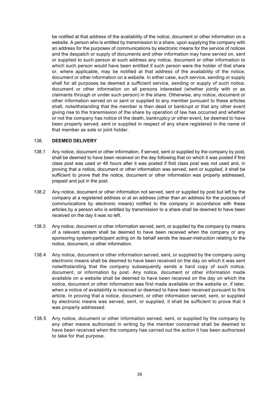 39 be notified at that address of the availability of the notice, document or other information on a website. A person who is entitled by transmission to a share, upon supplying the company with an address for the purposes of communications by electronic means for the service of notices and the despatch or supply of documents and other information may have served on, sent or supplied to such person at such address any notice, document or other information to which such person would have been entitled if such person were the holder of that share or, where applicable, may be notified at that address of the availability of the notice, document or other information on a website. In either case, such service, sending or supply shall for all purposes be deemed a sufficient service, sending or supply of such notice, document or other information on all persons interested (whether jointly with or as claimants through or under such person) in the share. Otherwise, any notice, document or other information served on or sent or supplied to any member pursuant to these articles shall, notwithstanding that the member is then dead or bankrupt or that any other event giving rise to the transmission of the share by operation of law has occurred and whether or not the company has notice of the death, bankruptcy or other event, be deemed to have been properly served, sent or supplied in respect of any share registered in the name of that member as sole or joint holder. 138. DEEMED DELIVERY 138.1 Any notice, document or other information, if served, sent or supplied by the company by post, shall be deemed to have been received on the day following that on which it was posted if first class post was used or 48 hours after it was posted if first class post was not used and, in proving that a notice, document or other information was served, sent or supplied, it shall be sufficient to prove that the notice, document or other information was properly addressed, prepaid and put in the post. 138.2 Any notice, document or other information not served, sent or supplied by post but left by the company at a registered address or at an address (other than an address for the purposes of communications by electronic means) notified to the company in accordance with these articles by a person who is entitled by transmission to a share shall be deemed to have been received on the day it was so left. 138.3 Any notice, document or other information served, sent, or supplied by the company by means of a relevant system shall be deemed to have been received when the company or any sponsoring system-participant acting on its behalf sends the issuer-instruction relating to the notice, document, or other information. 138.4 Any notice, document or other information served, sent, or supplied by the company using electronic means shall be deemed to have been received on the day on which it was sent notwithstanding that the company subsequently sends a hard copy of such notice, document, or information by post. Any notice, document or other information made available on a website shall be deemed to have been received on the day on which the notice, document or other information was first made available on the website or, if later, when a notice of availability is received or deemed to have been received pursuant to this article. In proving that a notice, document, or other information served, sent, or supplied by electronic means was served, sent, or supplied, it shall be sufficient to prove that it was properly addressed. 138.5 Any notice, document or other information served, sent, or supplied by the company by any other means authorised in writing by the member concerned shall be deemed to have been received when the company has carried out the action it has been authorised to take for that purpose.