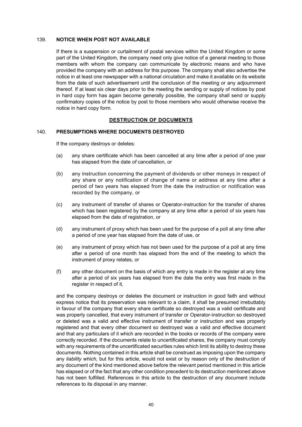 40 139. NOTICE WHEN POST NOT AVAILABLE If there is a suspension or curtailment of postal services within the United Kingdom or some part of the United Kingdom, the company need only give notice of a general meeting to those members with whom the company can communicate by electronic means and who have provided the company with an address for this purpose. The company shall also advertise the notice in at least one newspaper with a national circulation and make it available on its website from the date of such advertisement until the conclusion of the meeting or any adjournment thereof. If at least six clear days prior to the meeting the sending or supply of notices by post in hard copy form has again become generally possible, the company shall send or supply confirmatory copies of the notice by post to those members who would otherwise receive the notice in hard copy form. DESTRUCTION OF DOCUMENTS 140. PRESUMPTIONS WHERE DOCUMENTS DESTROYED If the company destroys or deletes: (a) any share certificate which has been cancelled at any time after a period of one year has elapsed from the date of cancellation, or (b) any instruction concerning the payment of dividends or other moneys in respect of any share or any notification of change of name or address at any time after a period of two years has elapsed from the date the instruction or notification was recorded by the company, or (c) any instrument of transfer of shares or Operator-instruction for the transfer of shares which has been registered by the company at any time after a period of six years has elapsed from the date of registration, or (d) any instrument of proxy which has been used for the purpose of a poll at any time after a period of one year has elapsed from the date of use, or (e) any instrument of proxy which has not been used for the purpose of a poll at any time after a period of one month has elapsed from the end of the meeting to which the instrument of proxy relates, or (f) any other document on the basis of which any entry is made in the register at any time after a period of six years has elapsed from the date the entry was first made in the register in respect of it, and the company destroys or deletes the document or instruction in good faith and without express notice that its preservation was relevant to a claim, it shall be presumed irrebuttably in favour of the company that every share certificate so destroyed was a valid certificate and was properly cancelled, that every instrument of transfer or Operator-instruction so destroyed or deleted was a valid and effective instrument of transfer or instruction and was properly registered and that every other document so destroyed was a valid and effective document and that any particulars of it which are recorded in the books or records of the company were correctly recorded. If the documents relate to uncertificated shares, the company must comply with any requirements of the uncertificated securities rules which limit its ability to destroy these documents. Nothing contained in this article shall be construed as imposing upon the company any liability which, but for this article, would not exist or by reason only of the destruction of any document of the kind mentioned above before the relevant period mentioned in this article has elapsed or of the fact that any other condition precedent to its destruction mentioned above has not been fulfilled. References in this article to the destruction of any document include references to its disposal in any manner.