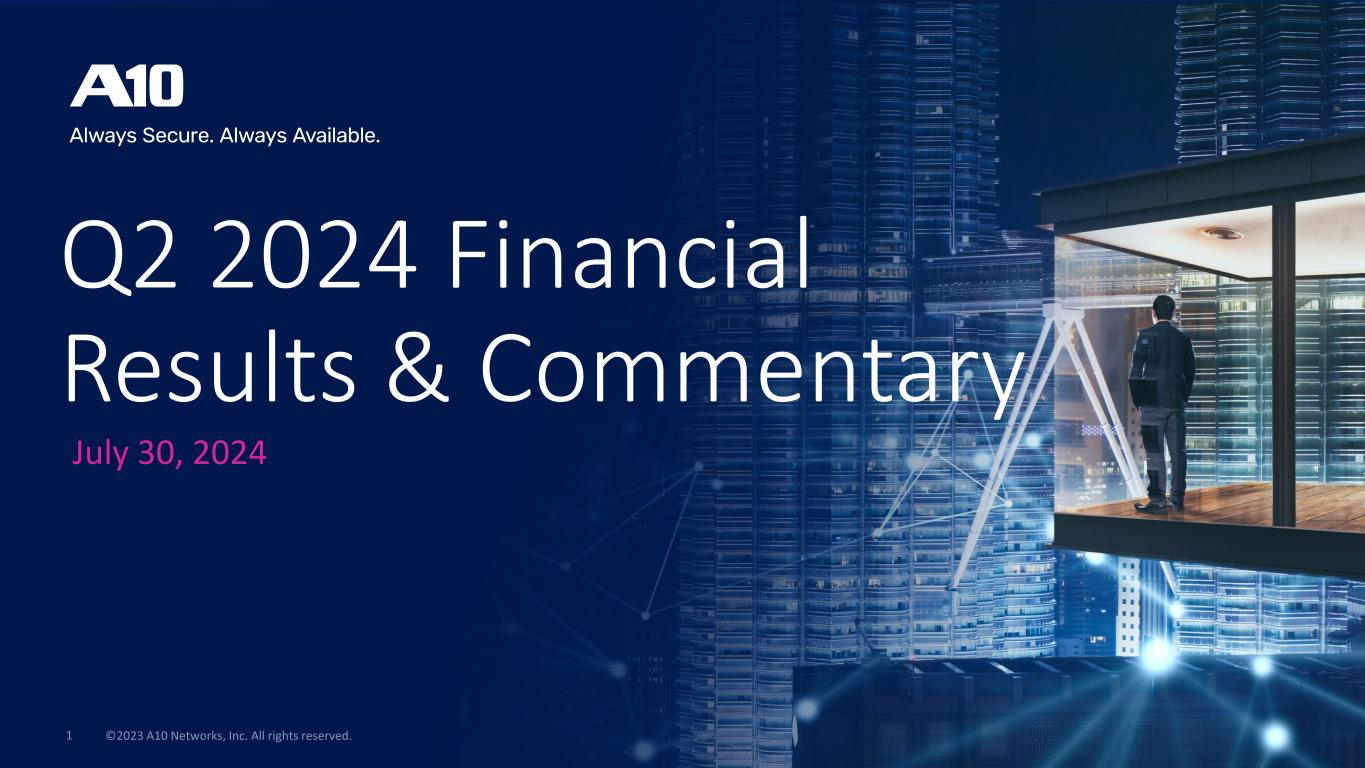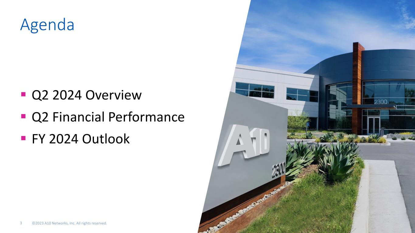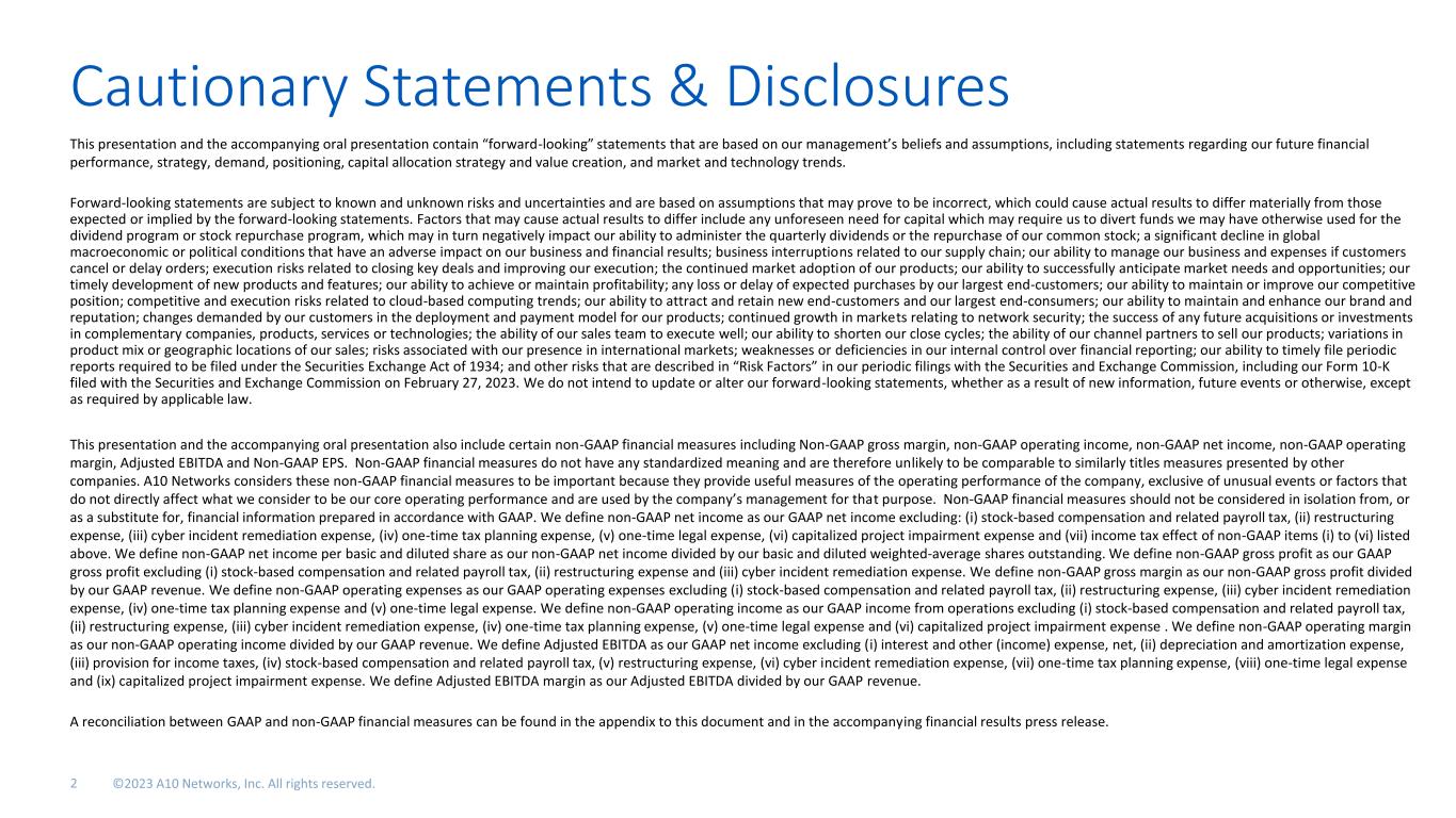 Cautionary Statements & Disclosures This presentation and the accompanying oral presentation contain “forward-looking” statements that are based on our management’s beliefs and assumptions, including statements regarding our future financial performance, strategy, demand, positioning, capital allocation strategy and value creation, and market and technology trends. Forward-looking statements are subject to known and unknown risks and uncertainties and are based on assumptions that may prove to be incorrect, which could cause actual results to differ materially from those expected or implied by the forward-looking statements. Factors that may cause actual results to differ include any unforeseen need for capital which may require us to divert funds we may have otherwise used for the dividend program or stock repurchase program, which may in turn negatively impact our ability to administer the quarterly dividends or the repurchase of our common stock; a significant decline in global macroeconomic or political conditions that have an adverse impact on our business and financial results; business interruptions related to our supply chain; our ability to manage our business and expenses if customers cancel or delay orders; execution risks related to closing key deals and improving our execution; the continued market adoption of our products; our ability to successfully anticipate market needs and opportunities; our timely development of new products and features; our ability to achieve or maintain profitability; any loss or delay of expected purchases by our largest end-customers; our ability to maintain or improve our competitive position; competitive and execution risks related to cloud-based computing trends; our ability to attract and retain new end-customers and our largest end-consumers; our ability to maintain and enhance our brand and reputation; changes demanded by our customers in the deployment and payment model for our products; continued growth in markets relating to network security; the success of any future acquisitions or investments in complementary companies, products, services or technologies; the ability of our sales team to execute well; our ability to shorten our close cycles; the ability of our channel partners to sell our products; variations in product mix or geographic locations of our sales; risks associated with our presence in international markets; weaknesses or deficiencies in our internal control over financial reporting; our ability to timely file periodic reports required to be filed under the Securities Exchange Act of 1934; and other risks that are described in “Risk Factors” in our periodic filings with the Securities and Exchange Commission, including our Form 10-K filed with the Securities and Exchange Commission on February 27, 2023. We do not intend to update or alter our forward-looking statements, whether as a result of new information, future events or otherwise, except as required by applicable law. This presentation and the accompanying oral presentation also include certain non-GAAP financial measures including Non-GAAP gross margin, non-GAAP operating income, non-GAAP net income, non-GAAP operating margin, Adjusted EBITDA and Non-GAAP EPS. Non-GAAP financial measures do not have any standardized meaning and are therefore unlikely to be comparable to similarly titles measures presented by other companies. A10 Networks considers these non-GAAP financial measures to be important because they provide useful measures of the operating performance of the company, exclusive of unusual events or factors that do not directly affect what we consider to be our core operating performance and are used by the company’s management for that purpose. Non-GAAP financial measures should not be considered in isolation from, or as a substitute for, financial information prepared in accordance with GAAP. We define non-GAAP net income as our GAAP net income excluding: (i) stock-based compensation and related payroll tax, (ii) restructuring expense, (iii) cyber incident remediation expense, (iv) one-time tax planning expense, (v) one-time legal expense, (vi) capitalized project impairment expense and (vii) income tax effect of non-GAAP items (i) to (vi) listed above. We define non-GAAP net income per basic and diluted share as our non-GAAP net income divided by our basic and diluted weighted-average shares outstanding. We define non-GAAP gross profit as our GAAP gross profit excluding (i) stock-based compensation and related payroll tax, (ii) restructuring expense and (iii) cyber incident remediation expense. We define non-GAAP gross margin as our non-GAAP gross profit divided by our GAAP revenue. We define non-GAAP operating expenses as our GAAP operating expenses excluding (i) stock-based compensation and related payroll tax, (ii) restructuring expense, (iii) cyber incident remediation expense, (iv) one-time tax planning expense and (v) one-time legal expense. We define non-GAAP operating income as our GAAP income from operations excluding (i) stock-based compensation and related payroll tax, (ii) restructuring expense, (iii) cyber incident remediation expense, (iv) one-time tax planning expense, (v) one-time legal expense and (vi) capitalized project impairment expense . We define non-GAAP operating margin as our non-GAAP operating income divided by our GAAP revenue. We define Adjusted EBITDA as our GAAP net income excluding (i) interest and other (income) expense, net, (ii) depreciation and amortization expense, (iii) provision for income taxes, (iv) stock-based compensation and related payroll tax, (v) restructuring expense, (vi) cyber incident remediation expense, (vii) one-time tax planning expense, (viii) one-time legal expense and (ix) capitalized project impairment expense. We define Adjusted EBITDA margin as our Adjusted EBITDA divided by our GAAP revenue. A reconciliation between GAAP and non-GAAP financial measures can be found in the appendix 