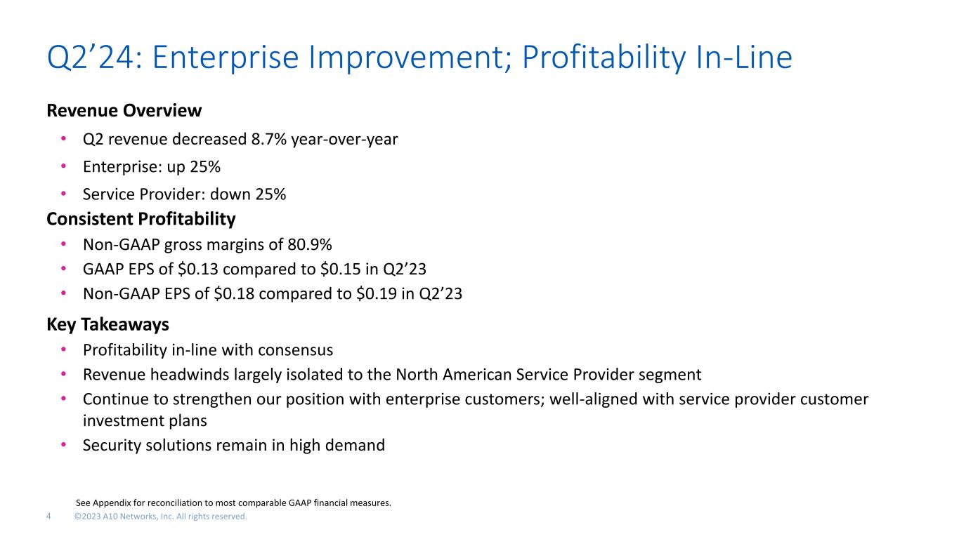 Q2’24: Enterprise Improvement; Profitability In-Line Revenue Overview • Q2 revenue decreased 8.7% year-over-year • Enterprise: up 25% • Service Provider: down 25% Consistent Profitability • Non-GAAP gross margins of 80.9% • GAAP EPS of $0.13 compared to $0.15 in Q2’23 • Non-GAAP EPS of $0.18 compared to $0.19 in Q2’23 Key Takeaways • Profitability in-line with consensus • Revenue headwinds largely isolated to the North American Service Provider segment • Continue to strengthen our position with enterprise customers; well-aligned with service provider customer investment plans • Security solutions remain in high demand See Appendix for reconciliation to most comparable GAAP financial measures.