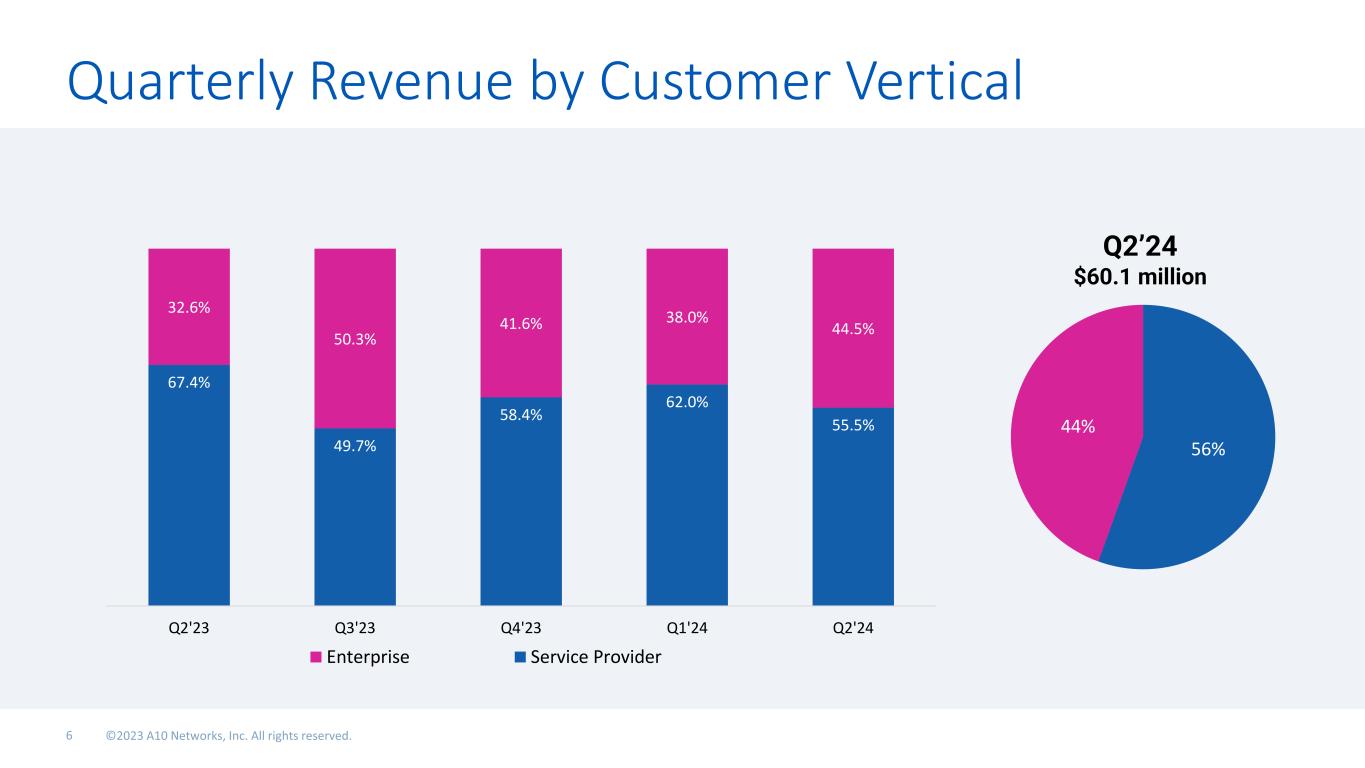 56% 44% Q2’24 $60.1 million Quarterly Revenue by Customer Vertical 67.4% 49.7% 58.4% 62.0% 55.5% 32.6% 50.3% 41.6% 38.0% 44.5% Q2'23 Q3'23 Q4'23 Q1'24 Q2'24 Enterprise Service Provider