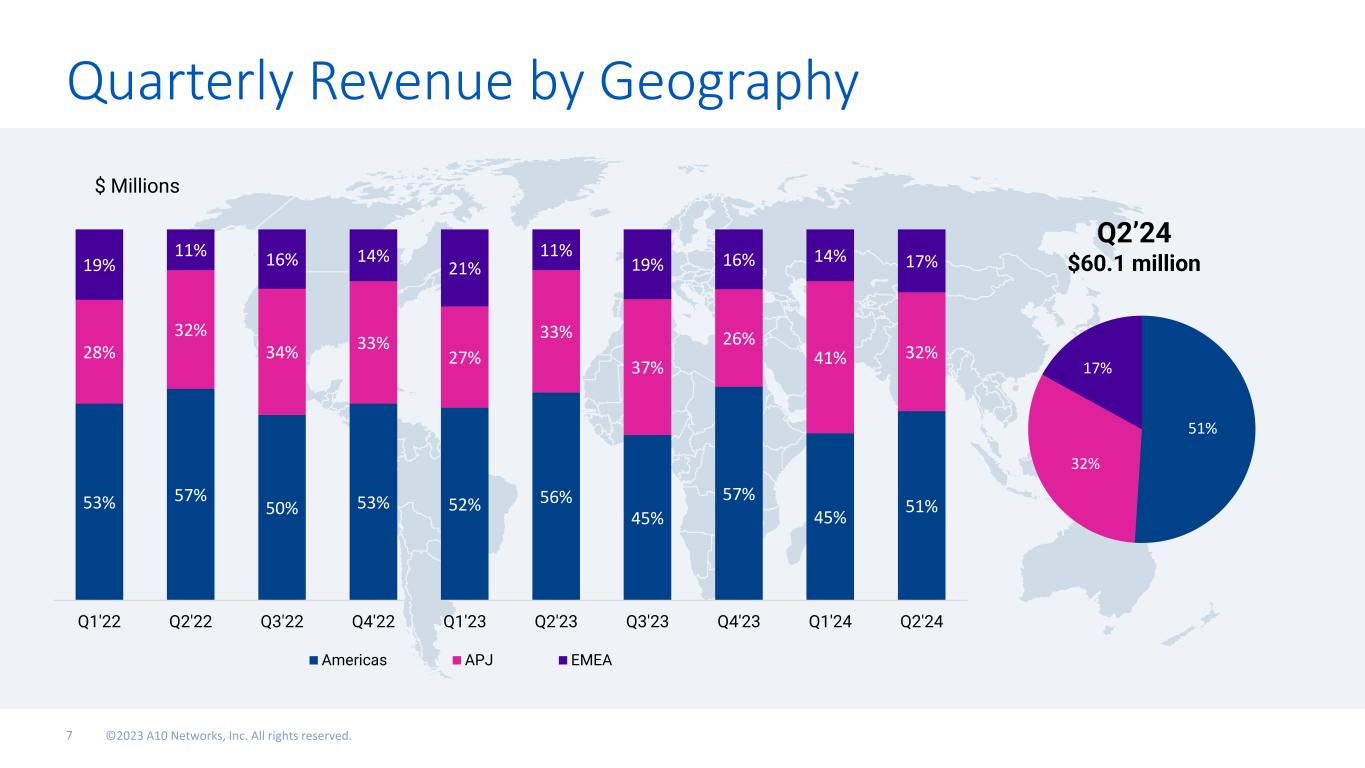 Quarterly Revenue by Geography 53% 57% 50% 53% 52% 56% 45% 57% 45% 51% 28% 32% 34% 33% 27% 33% 37% 26% 41% 32% 19% 11% 16% 14% 21% 11% 19% 16% 14% 17% Q1'22 Q2'22 Q3'22 Q4'22 Q1'23 Q2'23 Q3'23 Q4'23 Q1'24 Q2'24 $ Millions Americas APJ EMEA 51% 32% 17% Q2’24 $60.1 million