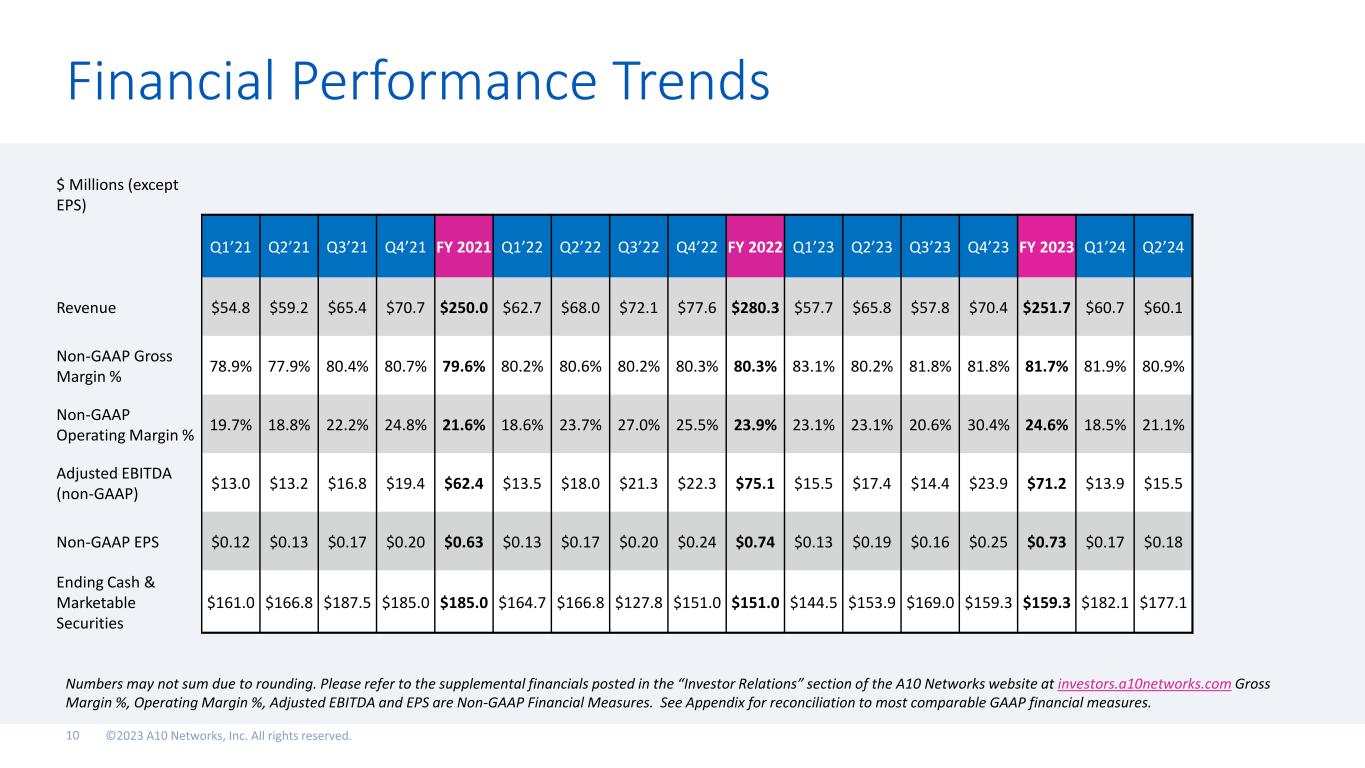 Financial Performance Trends Numbers may not sum due to rounding. Please refer to the supplemental financials posted in the “Investor Relations” section of the A10 Networks website at investors.a10networks.com Gross Margin %, Operating Margin %, Adjusted EBITDA and EPS are Non-GAAP Financial Measures. See Appendix for reconciliation to most comparable GAAP financial measures. $ Millions (except EPS) Q1’21 Q2’21 Q3’21 Q4’21 FY 2021 Q1’22 Q2’22 Q3’22 Q4’22 FY 2022 Q1’23 Q2’23 Q3’23 Q4’23 FY 2023 Q1’24 Q2’24 Revenue $54.8 $59.2 $65.4 $70.7 $250.0 $62.7 $68.0 $72.1 $77.6 $280.3 $57.7 $65.8 $57.8 $70.4 $251.7 $60.7 $60.1 Non-GAAP Gross Margin % 78.9% 77.9% 80.4% 80.7% 79.6% 80.2% 80.6% 80.2% 80.3% 80.3% 83.1% 80.2% 81.8% 81.8% 81.7% 81.9% 80.9% Non-GAAP Operating Margin % 19.7% 18.8% 22.2% 24.8% 21.6% 18.6% 23.7% 27.0% 25.5% 23.9% 23.1% 23.1% 20.6% 30.4% 24.6% 18.5% 21.1% Adjusted EBITDA (non-GAAP) $13.0 $13.2 $16.8 $19.4 $62.4 $13.5 $18.0 $21.3 $22.3 $75.1 $15.5 $17.4 $14.4 $23.9 $71.2 $13.9 $15.5 Non-GAAP EPS $0.12 $0.13 $0.17 $0.20 $0.63 $0.13 $0.17 $0.20 $0.24 $0.74 $0.13 $0.19 $0.16 $0.25 $0.73 $0.17 $0.18 Ending Cash & Marketable Securities $161.0 $166.8 $187.5 $185.0 $185.0 $164.7 $166.8 $127.8 $151.0 $151.0 $144.5 $153.9 $169.0 $159.3 $159.3 $182.1 $177.1