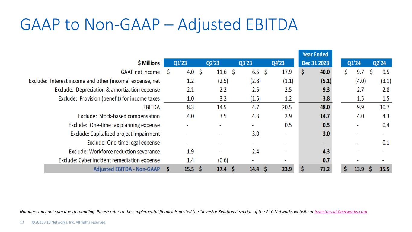 GAAP to Non-GAAP – Adjusted EBITDA Numbers may not sum due to rounding. Please refer to the supplemental financials posted the “Investor Relations” section of the A10 Networks website at investors.a10networks.com.