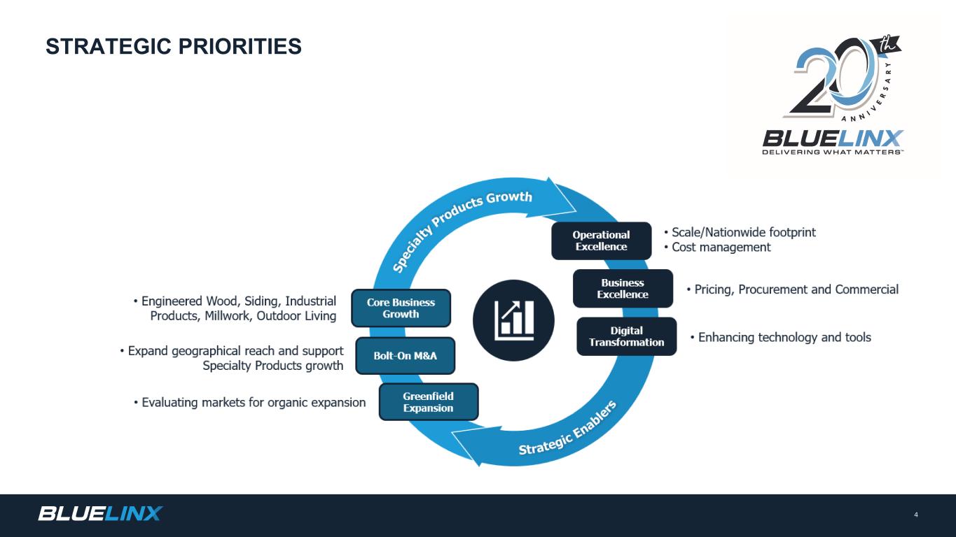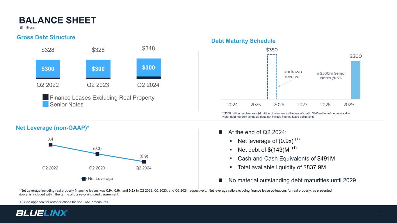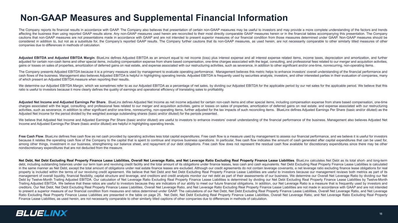 The Company reports its financial results in accordance with GAAP. The Company also believes that presentation of certain non-GAAP measures may be useful to investors and may provide a more complete understanding of the factors and trends affecting the business than using reported GAAP results alone. Any non-GAAP measures used herein are reconciled to their most directly comparable GAAP measures herein or in the financial tables accompanying this presentation. The Company cautions that non-GAAP measures are not presentations made in accordance with GAAP and are not intended to present superior measures of our financial condition from those measures determined under GAAP. Non-GAAP measures should be considered in addition to, but not as a substitute for, the Company’s reported GAAP results. The Company further cautions that its non-GAAP measures, as used herein, are not necessarily comparable to other similarly titled measures of other companies due to differences in methods of calculation. Adjusted EBITDA and Adjusted EBITDA Margin. BlueLinx defines Adjusted EBITDA as an amount equal to net income (loss) plus interest expense and all interest expense related items, income taxes, depreciation and amortization, and further adjusted for certain non-cash items and other special items, including compensation expense from share based compensation, one-time charges associated with the legal, consulting, and professional fees related to our merger and acquisition activities, gains or losses on sales of properties, amortization of deferred gains on real estate, and expense associated with our restructuring activities, such as severance, in addition to other significant and/or one-time, nonrecurring, non-operating items. The Company presents Adjusted EBITDA because it is a primary measure used by management to evaluate operating performance. Management believes this metric helps to enhance investors’ overall understanding of the financial performance and cash flows of the business. Management also believes Adjusted EBITDA is helpful in highlighting operating trends. Adjusted EBITDA is frequently used by securities analysts, investors, and other interested parties in their evaluation of companies, many of which present an Adjusted EBITDA measure when reporting their results. We determine our Adjusted EBITDA Margin, which we sometimes refer to as our Adjusted EBITDA as a percentage of net sales, by dividing our Adjusted EBITDA for the applicable period by our net sales for the applicable period. We believe that this ratio is useful to investors because it more clearly defines the quality of earnings and operational efficiency of translating sales to profitability. Adjusted Net Income and Adjusted Earnings Per Share. BlueLinx defines Adjusted Net Income as net income adjusted for certain non-cash items and other special items, including compensation expense from share based compensation, one-time charges associated with the legal, consulting, and professional fees related to our merger and acquisition activities, gains or losses on sales of properties, amortization of deferred gains on real estate, and expense associated with our restructuring activities, such as severance, in addition to other significant and/or one-time, nonrecurring, non-operating items, further adjusted for the tax impacts of such reconciling items. BlueLinx defines Adjusted Earnings Per Share (basic and/or diluted) as the Adjusted Net Income for the period divided by the weighted average outstanding shares (basic and/or diluted) for the periods presented. We believe that Adjusted Net Income and Adjusted Earnings Per Share (basic and/or diluted) are useful to investors to enhance investors’ overall understanding of the financial performance of the business. Management also believes Adjusted Net Income and Adjusted Earnings Per Share (basic and/or diluted) are helpful in highlighting operating trends. Free Cash Flow. BlueLinx defines free cash flow as net cash provided by operating activities less total capital expenditures. Free cash flow is a measure used by management to assess our financial performance, and we believe it is useful for investors because it relates the operating cash flow of the Company to the capital that is spent to continue and improve business operations. In particular, free cash flow indicates the amount of cash generated after capital expenditures that can be used for, among other things, investment in our business, strengthening our balance sheet, and repayment of our debt obligations. Free cash flow does not represent the residual cash flow available for discretionary expenditures since there may be other nondiscretionary expenditures that are not deducted from the measure. Net Debt, Net Debt Excluding Real Property Finance Lease Liabilities, Overall Net Leverage Ratio, and Net Leverage Ratio Excluding Real Property Finance Lease Liabilities. BlueLinx calculates Net Debt as its total short- and long-term debt, including outstanding balances under our term loan and revolving credit facility and the total amount of its obligations under finance leases, less cash and cash equivalents. Net Debt Excluding Real Property Finance Lease Liabilities is calculated in the same manner as Net Debt, except the total amount of obligations under real estate finance leases are excluded. Although our credit agreements do not contain leverage covenants, a net leverage ratio excluding finance lease obligations for real property is included within the terms of our revolving credit agreement. We believe that Net Debt and Net Debt Excluding Real Property Finance Lease Liabilities are useful to investors because our management reviews both metrics as part of its management of overall liquidity, financial flexibility, capital structure and leverage, and creditors and credit analysts monitor our net debt as part of their assessments of our business. We determine our Overall Net Leverage Ratio by dividing our Net Debt by Twel