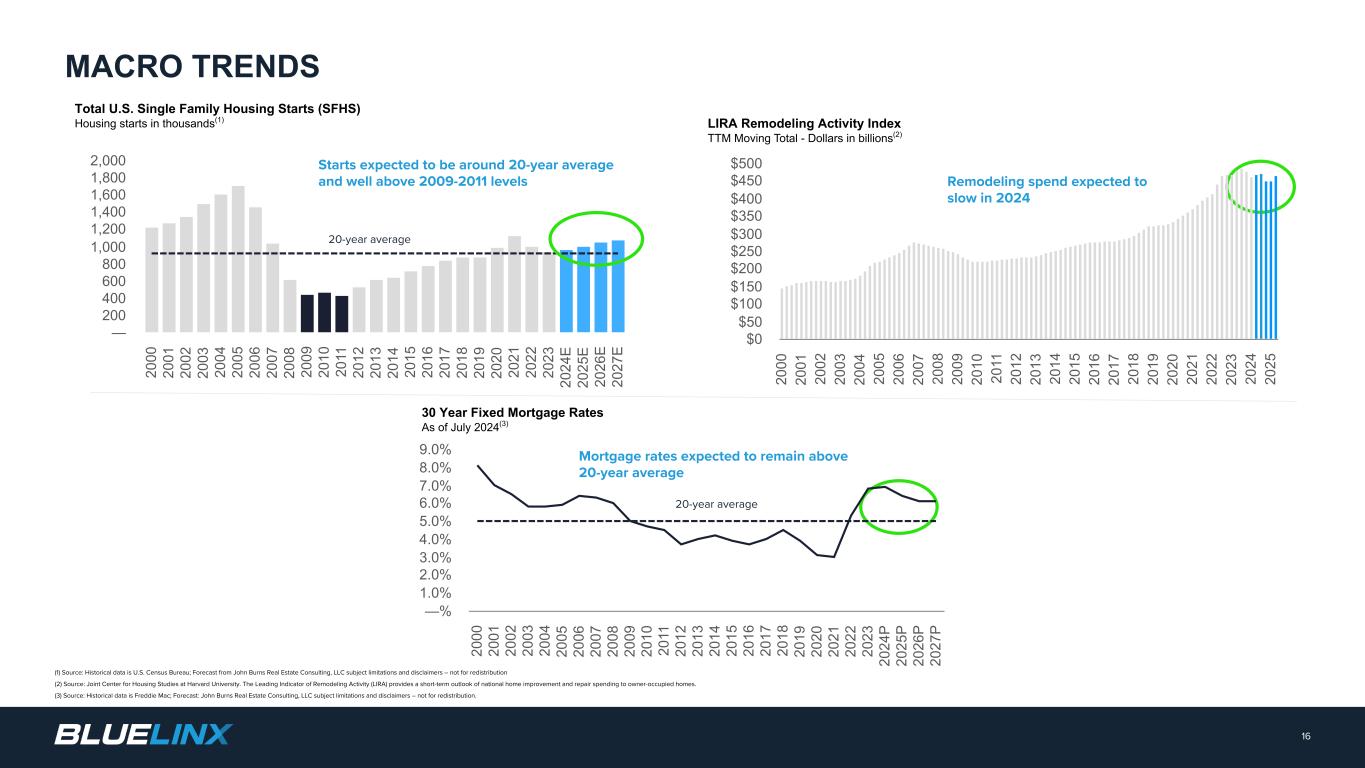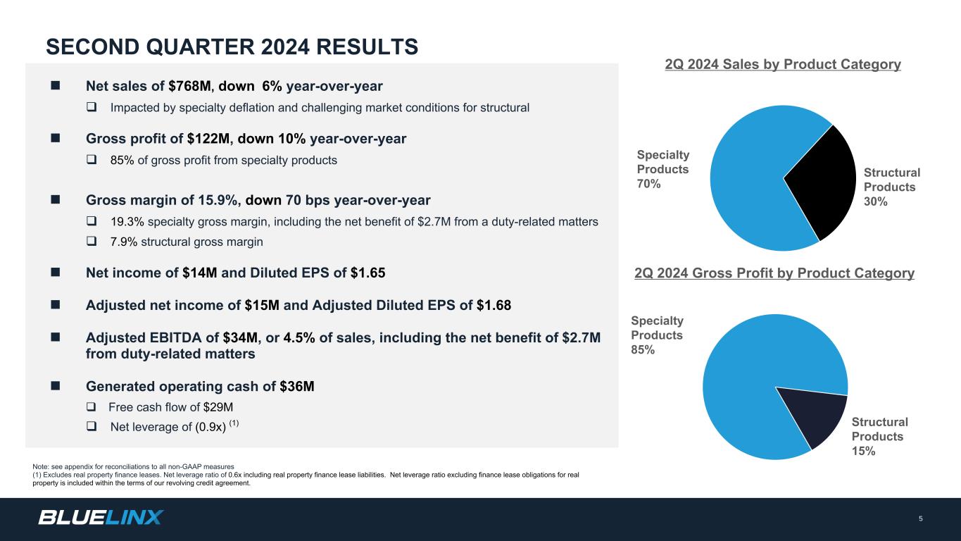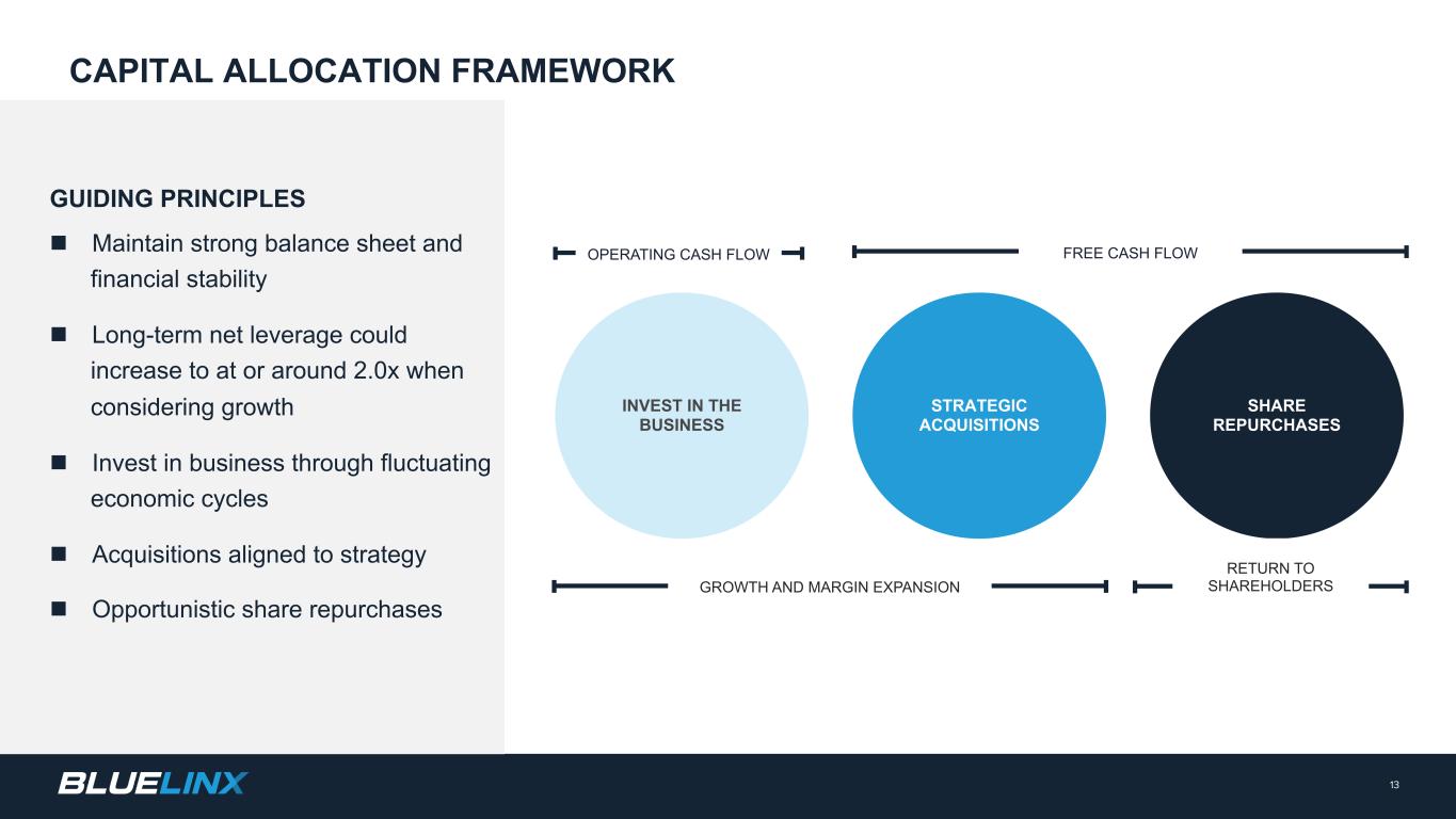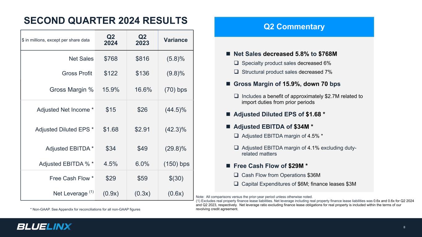 The Company reports its financial results in accordance with GAAP. The Company also believes that presentation of certain non-GAAP measures may be useful to investors and may provide a more complete understanding of the factors and trends affecting the business than using reported GAAP results alone. Any non-GAAP measures used herein are reconciled to their most directly comparable GAAP measures herein or in the financial tables accompanying this presentation. The Company cautions that non-GAAP measures are not presentations made in accordance with GAAP and are not intended to present superior measures of our financial condition from those measures determined under GAAP. Non-GAAP measures should be considered in addition to, but not as a substitute for, the Company’s reported GAAP results. The Company further cautions that its non-GAAP measures, as used herein, are not necessarily comparable to other similarly titled measures of other companies due to differences in methods of calculation. Adjusted EBITDA and Adjusted EBITDA Margin. BlueLinx defines Adjusted EBITDA as an amount equal to net income (loss) plus interest expense and all interest expense related items, income taxes, depreciation and amortization, and further adjusted for certain non-cash items and other special items, including compensation expense from share based compensation, one-time charges associated with the legal, consulting, and professional fees related to our merger and acquisition activities, gains or losses on sales of properties, amortization of deferred gains on real estate, and expense associated with our restructuring activities, such as severance, in addition to other significant and/or one-time, nonrecurring, non-operating items. The Company presents Adjusted EBITDA because it is a primary measure used by management to evaluate operating performance. Management believes this metric helps to enhance investors’ overall understanding of the financial performance and cash flows of the business. Management also believes Adjusted EBITDA is helpful in highlighting operating trends. Adjusted EBITDA is frequently used by securities analysts, investors, and other interested parties in their evaluation of companies, many of which present an Adjusted EBITDA measure when reporting their results. We determine our Adjusted EBITDA Margin, which we sometimes refer to as our Adjusted EBITDA as a percentage of net sales, by dividing our Adjusted EBITDA for the applicable period by our net sales for the applicable period. We believe that this ratio is useful to investors because it more clearly defines the quality of earnings and operational efficiency of translating sales to profitability. Adjusted Net Income and Adjusted Earnings Per Share. BlueLinx defines Adjusted Net Income as net income adjusted for certain non-cash items and other special items, including compensation expense from share based compensation, one-time charges associated with the legal, consulting, and professional fees related to our merger and acquisition activities, gains or losses on sales of properties, amortization of deferred gains on real estate, and expense associated with our restructuring activities, such as severance, in addition to other significant and/or one-time, nonrecurring, non-operating items, further adjusted for the tax impacts of such reconciling items. BlueLinx defines Adjusted Earnings Per Share (basic and/or diluted) as the Adjusted Net Income for the period divided by the weighted average outstanding shares (basic and/or diluted) for the periods presented. We believe that Adjusted Net Income and Adjusted Earnings Per Share (basic and/or diluted) are useful to investors to enhance investors’ overall understanding of the financial performance of the business. Management also believes Adjusted Net Income and Adjusted Earnings Per Share (basic and/or diluted) are helpful in highlighting operating trends. Free Cash Flow. BlueLinx defines free cash flow as net cash provided by operating activities less total capital expenditures. Free cash flow is a measure used by management to assess our financial performance, and we believe it is useful for investors because it relates the operating cash flow of the Company to the capital that is spent to continue and improve business operations. In particular, free cash flow indicates the amount of cash generated after capital expenditures that can be used for, among other things, investment in our business, strengthening our balance sheet, and repayment of our debt obligations. Free cash flow does not represent the residual cash flow available for discretionary expenditures since there may be other nondiscretionary expenditures that are not deducted from the measure. Net Debt, Net Debt Excluding Real Property Finance Lease Liabilities, Overall Net Leverage Ratio, and Net Leverage Ratio Excluding Real Property Finance Lease Liabilities. BlueLinx calculates Net Debt as its total short- and long-term debt, including outstanding balances under our term loan and revolving credit facility and the total amount of its obligations under finance leases, less cash and cash equivalents. Net Debt Excluding Real Property Finance Lease Liabilities is calculated in the same manner as Net Debt, except the total amount of obligations under real estate finance leases are excluded. Although our credit agreements do not contain leverage covenants, a net leverage ratio excluding finance lease obligations for real property is included within the terms of our revolving credit agreement. We believe that Net Debt and Net Debt Excluding Real Property Finance Lease Liabilities are useful to investors because our management reviews both metrics as part of its management of overall liquidity, financial flexibility, capital structure and leverage, and creditors and credit analysts monitor our net debt as part of their assessments of our business. We determine our Overall Net Leverage Ratio by dividing our Net Debt by Twel