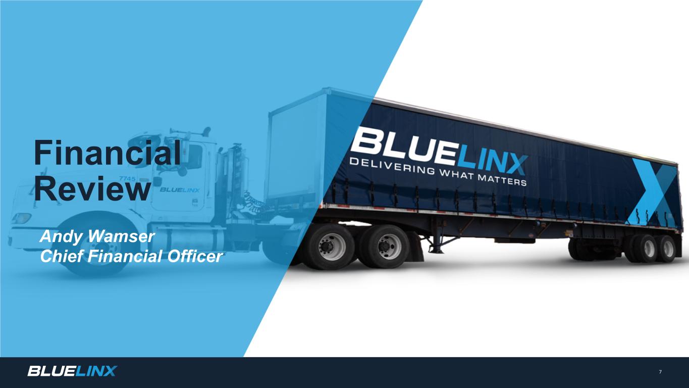 n New home starts decelerating q June single-family housing starts down 2% from May, lowest levels since October 2023 q Builder's confidence was 42 in July, down 14 points from July 2023 and down slightly from June 2024 after improving earlier the year (1) n Home affordability remains challenging q Mortgage rates remain elevated q Home price appreciation n Repair and remodel market expected to decline in 2024(2) q 2024 spend expected to be lower than 2023 and 2022(2) q Existing home sales remain low Note: Management’s estimate by end market for two-step distribution of building materials (1) Source: NAHB Housing Market Index (HMI) is based on a monthly survey of NAHB members designed to take the pulse of the single-family housing market. The survey asks respondents to rate market conditions for the sale of new homes at the present time and in the next six months as well as the traffic of prospective buyers of new homes (2) Source: Joint Center for Housing Studies at Harvard University. The Leading Indicator of Remodeling Activity (LIRA) provides a short-term outlook of national home improvement and repair spending to owner-occupied homes. 6 U.S. HOUSING INDUSTRY BLUELINX SALES BY END MARKET Repair & Remodel 45% New Home Construction 40% Commercial 15%