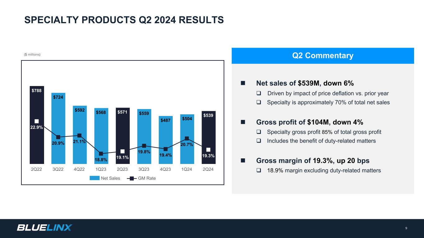 n Net Sales decreased 5.8% to $768M q Specialty product sales decreased 6% q Structural product sales decreased 7% n Gross Margin of 15.9%, down 70 bps q Includes a benefit of approximately $2.7M related to import duties from prior periods n Adjusted Diluted EPS of $1.68 * n Adjusted EBITDA of $34M * q Adjusted EBITDA margin of 4.5% * q Adjusted EBITDA margin of 4.1% excluding duty- related matters n Free Cash Flow of $29M * q Cash Flow from Operations $36M q Capital Expenditures of $6M; finance leases $3M 8 SECOND QUARTER 2024 RESULTS Note: All comparisons versus the prior-year period unless otherwise noted. (1) Excludes real property finance lease liabilities. Net leverage including real property finance lease liabilities was 0.6x and 0.6x for Q2 2024 and Q2 2023, respectively. Net leverage ratio excluding finance lease obligations for real property is included within the terms of our revolving credit agreement. Q2 Commentary $ in millions, except per share data Q2 2024 Q2 2023 Variance Net Sales $768 $816 (5.8)% Gross Profit $122 $136 (9.8)% Gross Margin % 15.9% 16.6% (70) bps Adjusted Net Income * $15 $26 (44.5)% Adjusted Diluted EPS * $1.68 $2.91 (42.3)% Adjusted EBITDA * $34 $49 (29.8)% Adjusted EBITDA % * 4.5% 6.0% (150) bps Free Cash Flow * $29 $59 $(30) Net Leverage (1) (0.9x) (0.3x) (0.6x) * Non-GAAP. See Appendix for reconciliations for all non-GAAP figures