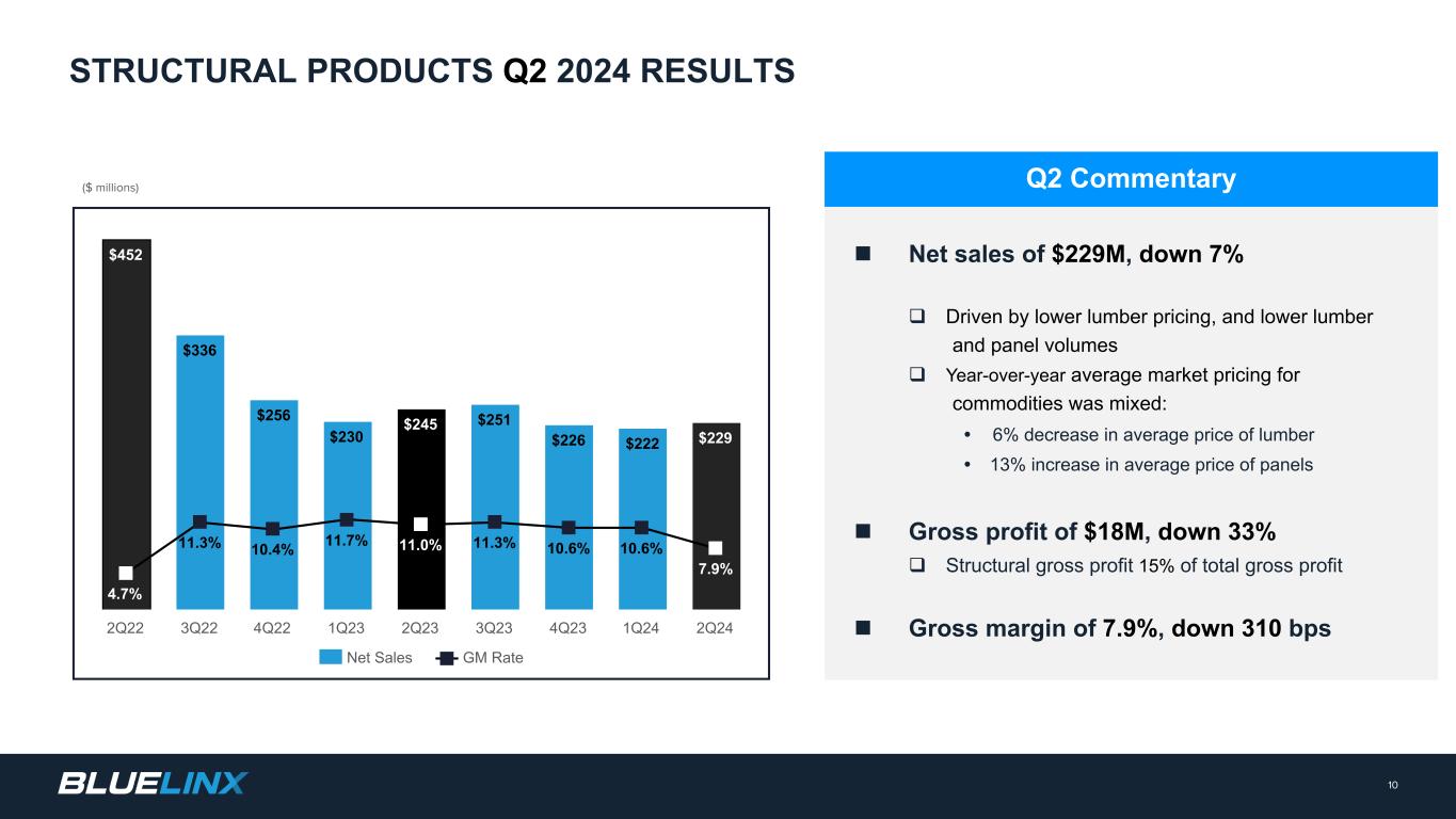 ($ millions) n Net sales of $539M, down 6% q Driven by impact of price deflation vs. prior year q Specialty is approximately 70% of total net sales n Gross profit of $104M, down 4% q Specialty gross profit 85% of total gross profit q Includes the benefit of duty-related matters n Gross margin of 19.3%, up 20 bps q 18.9% margin excluding duty-related matters Q2 Commentary 9 SPECIALTY PRODUCTS Q2 2024 RESULTS $788 $724 $592 $568 $571 $559 $487 $504 $539 22.9% 20.9% 21.1% 18.8% 19.1% 19.8% 19.4% 20.7% 19.3% Net Sales GM Rate 2Q22 3Q22 4Q22 1Q23 2Q23 3Q23 4Q23 1Q24 2Q24