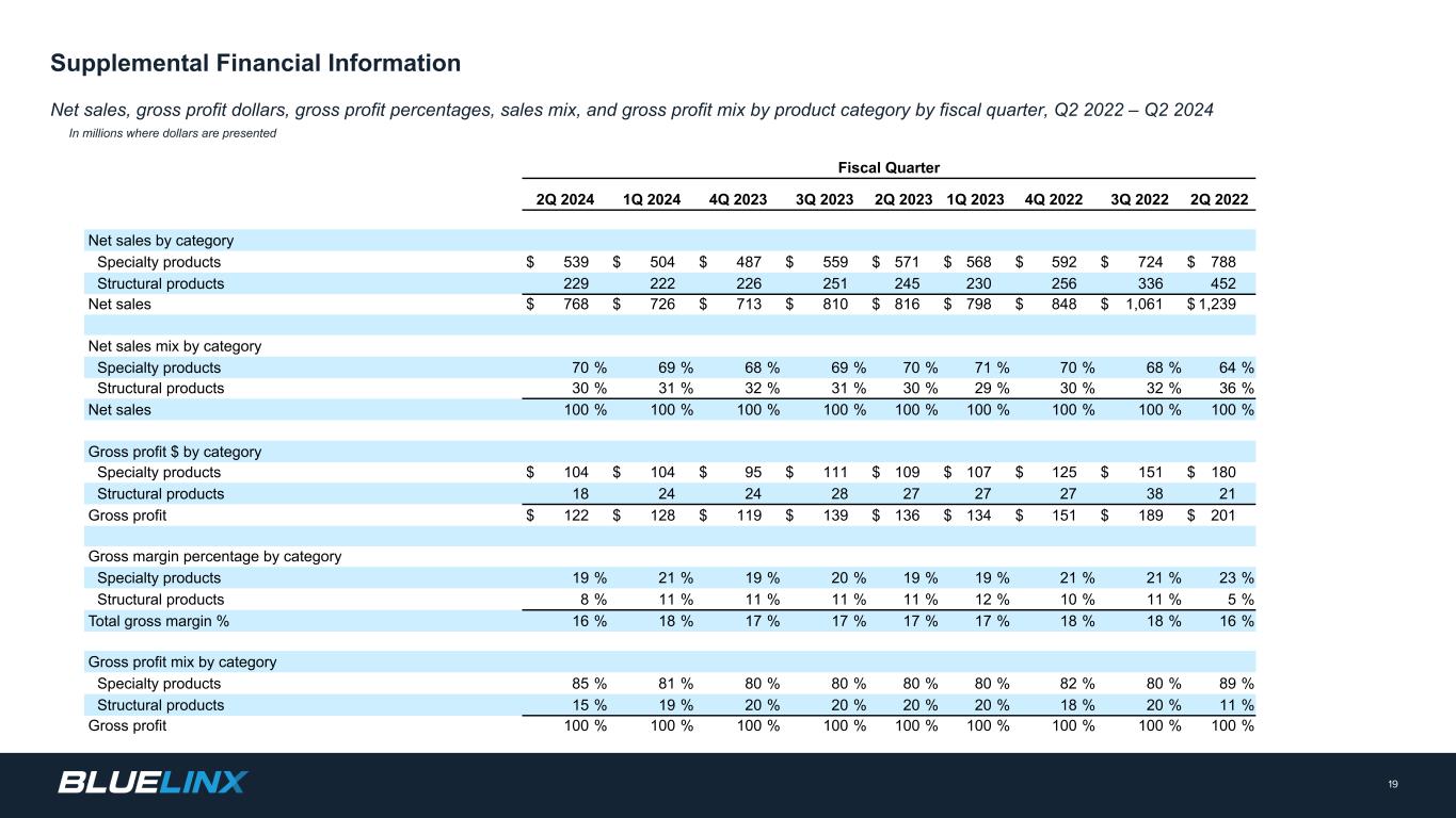 Supplemental Financial Information Net sales, gross profit dollars, gross profit percentages, sales mix, and gross profit mix by product category by fiscal quarter, Q2 2022 – Q2 2024 In millions where dollars are presented 19 Supplementary Financial Information Fiscal Quarter 2Q 2024 1Q 2024 4Q 2023 3Q 2023 2Q 2023 1Q 2023 4Q 2022 3Q 2022 2Q 2022 Net sales by category Specialty products $ 539 $ 504 $ 487 $ 559 $ 571 $ 568 $ 592 $ 724 $ 788 Structural products 229 222 226 251 245 230 256 336 452 Net sales $ 768 $ 726 $ 713 $ 810 $ 816 $ 798 $ 848 $ 1,061 $ 1,239 Net sales mix by category Specialty products 70 % 69 % 68 % 69 % 70 % 71 % 70 % 68 % 64 % Structural products 30 % 31 % 32 % 31 % 30 % 29 % 30 % 32 % 36 % Net sales 100 % 100 % 100 % 100 % 100 % 100 % 100 % 100 % 100 % Gross profit $ by category Specialty products $ 104 $ 104 $ 95 $ 111 $ 109 $ 107 $ 125 $ 151 $ 180 Structural products 18 24 24 28 27 27 27 38 21 Gross profit $ 122 $ 128 $ 119 $ 139 $ 136 $ 134 $ 151 $ 189 $ 201 Gross margin percentage by category Specialty products 19 % 21 % 19 % 20 % 19 % 19 % 21 % 21 % 23 % Structural products 8 % 11 % 11 % 11 % 11 % 12 % 10 % 11 % 5 % Total gross margin % 16 % 18 % 17 % 17 % 17 % 17 % 18 % 18 % 16 % Gross profit mix by category Specialty products 85 % 81 % 80 % 80 % 80 % 80 % 82 % 80 % 89 % Structural products 15 % 19 % 20 % 20 % 20 % 20 % 18 % 20 % 11 % Gross profit 100 % 100 % 100 % 100 % 100 % 100 % 100 % 100 % 100 %