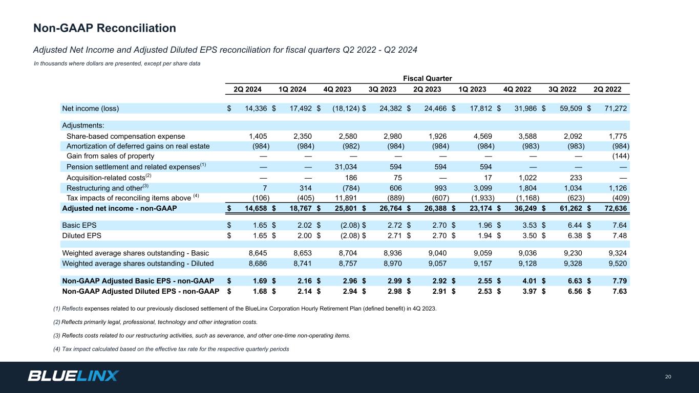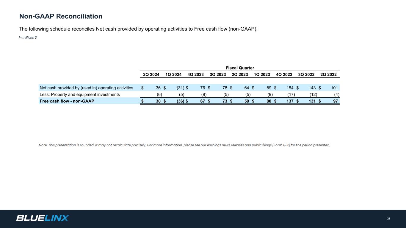 Adjusted Net Income and Adjusted Diluted EPS reconciliation for fiscal quarters Q2 2022 - Q2 2024 In thousands where dollars are presented, except per share data 20 Non-GAAP Reconciliation (1) Reflects expenses related to our previously disclosed settlement of the BlueLinx Corporation Hourly Retirement Plan (defined benefit) in 4Q 2023. (2) Reflects primarily legal, professional, technology and other integration costs. (3) Reflects costs related to our restructuring activities, such as severance, and other one-time non-operating items. (4) Tax impact calculated based on the effective tax rate for the respective quarterly periods Fiscal Quarter 2Q 2024 1Q 2024 4Q 2023 3Q 2023 2Q 2023 1Q 2023 4Q 2022 3Q 2022 2Q 2022 Net income (loss) $ 14,336 $ 17,492 $ (18,124) $ 24,382 $ 24,466 $ 17,812 $ 31,986 $ 59,509 $ 71,272 Adjustments: Share-based compensation expense 1,405 2,350 2,580 2,980 1,926 4,569 3,588 2,092 1,775 Amortization of deferred gains on real estate (984) (984) (982) (984) (984) (984) (983) (983) (984) Gain from sales of property — — — — — — — — (144) Pension settlement and related expenses(1) — — 31,034 594 594 594 — — — Acquisition-related costs(2) — — 186 75 — 17 1,022 233 — Restructuring and other(3) 7 314 (784) 606 993 3,099 1,804 1,034 1,126 Tax impacts of reconciling items above (4) (106) (405) 11,891 (889) (607) (1,933) (1,168) (623) (409) Adjusted net income - non-GAAP $ 14,658 $ 18,767 $ 25,801 $ 26,764 $ 26,388 $ 23,174 $ 36,249 $ 61,262 $ 72,636 Basic EPS $ 1.65 $ 2.02 $ (2.08) $ 2.72 $ 2.70 $ 1.96 $ 3.53 $ 6.44 $ 7.64 Diluted EPS $ 1.65 $ 2.00 $ (2.08) $ 2.71 $ 2.70 $ 1.94 $ 3.50 $ 6.38 $ 7.48 Weighted average shares outstanding - Basic 8,645 8,653 8,704 8,936 9,040 9,059 9,036 9,230 9,324 Weighted average shares outstanding - Diluted 8,686 8,741 8,757 8,970 9,057 9,157 9,128 9,328 9,520 Non-GAAP Adjusted Basic EPS - non-GAAP $ 1.69 $ 2.16 $ 2.96 $ 2.99 $ 2.92 $ 2.55 $ 4.01 $ 6.63 $ 7.79 Non-GAAP Adjusted Diluted EPS - non-GAAP $ 1.68 $ 2.14 $ 2.94 $ 2.98 $ 2.91 $ 2.53 $ 3.97 $ 6.56 $ 7.63