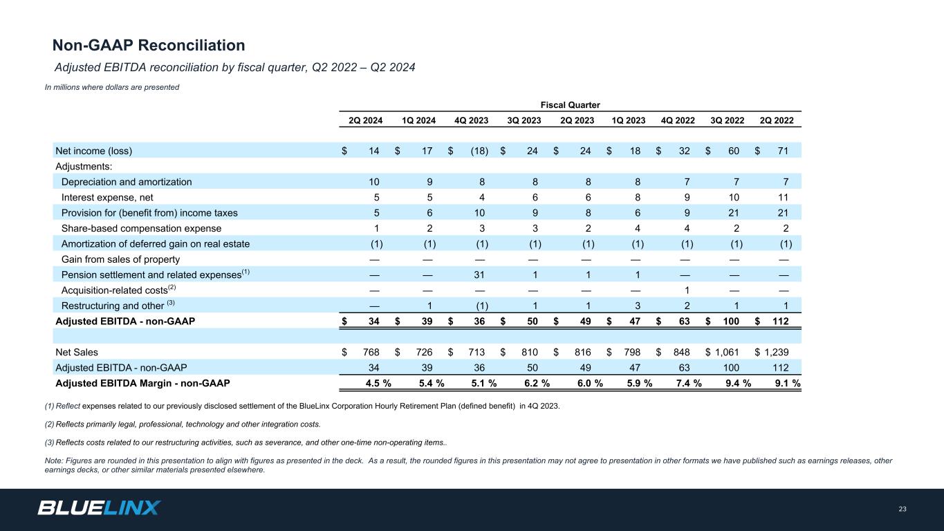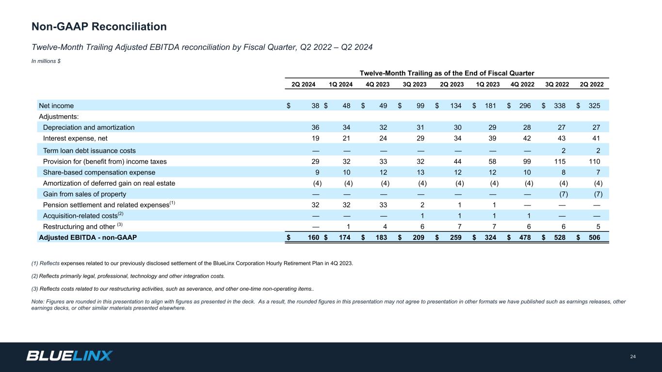 Adjusted EBITDA reconciliation by fiscal quarter, Q2 2022 – Q2 2024 In millions where dollars are presented 23 (1) Reflect expenses related to our previously disclosed settlement of the BlueLinx Corporation Hourly Retirement Plan (defined benefit) in 4Q 2023. (2) Reflects primarily legal, professional, technology and other integration costs. (3) Reflects costs related to our restructuring activities, such as severance, and other one-time non-operating items.. Note: Figures are rounded in this presentation to align with figures as presented in the deck. As a result, the rounded figures in this presentation may not agree to presentation in other formats we have published such as earnings releases, other earnings decks, or other similar materials presented elsewhere. Fiscal Quarter 2Q 2024 1Q 2024 4Q 2023 3Q 2023 2Q 2023 1Q 2023 4Q 2022 3Q 2022 2Q 2022 Net income (loss) $ 14 $ 17 $ (18) $ 24 $ 24 $ 18 $ 32 $ 60 $ 71 Adjustments: Depreciation and amortization 10 9 8 8 8 8 7 7 7 Interest expense, net 5 5 4 6 6 8 9 10 11 Provision for (benefit from) income taxes 5 6 10 9 8 6 9 21 21 Share-based compensation expense 1 2 3 3 2 4 4 2 2 Amortization of deferred gain on real estate (1) (1) (1) (1) (1) (1) (1) (1) (1) Gain from sales of property — — — — — — — — — Pension settlement and related expenses(1) — — 31 1 1 1 — — — Acquisition-related costs(2) — — — — — — 1 — — Restructuring and other (3) — 1 (1) 1 1 3 2 1 1 Adjusted EBITDA - non-GAAP $ 34 $ 39 $ 36 $ 50 $ 49 $ 47 $ 63 $ 100 $ 112 Net Sales $ 768 $ 726 $ 713 $ 810 $ 816 $ 798 $ 848 $ 1,061 $ 1,239 Adjusted EBITDA - non-GAAP 34 39 36 50 49 47 63 100 112 Adjusted EBITDA Margin - non-GAAP 4.5 % 5.4 % 5.1 % 6.2 % 6.0 % 5.9 % 7.4 % 9.4 % 9.1 % Non-GAAP Reconciliation