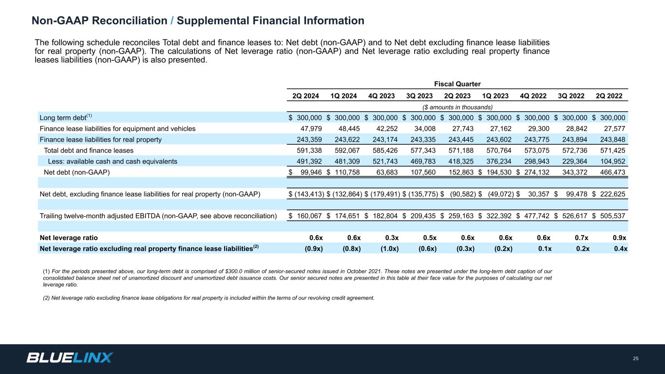 Twelve-Month Trailing Adjusted EBITDA reconciliation by Fiscal Quarter, Q2 2022 – Q2 2024 In millions $ 24 Non-GAAP Reconciliation (1) Reflects expenses related to our previously disclosed settlement of the BlueLinx Corporation Hourly Retirement Plan in 4Q 2023. (2) Reflects primarily legal, professional, technology and other integration costs. (3) Reflects costs related to our restructuring activities, such as severance, and other one-time non-operating items.. Note: Figures are rounded in this presentation to align with figures as presented in the deck. As a result, the rounded figures in this presentation may not agree to presentation in other formats we have published such as earnings releases, other earnings decks, or other similar materials presented elsewhere. Twelve-Month Trailing as of the End of Fiscal Quarter 2Q 2024 1Q 2024 4Q 2023 3Q 2023 2Q 2023 1Q 2023 4Q 2022 3Q 2022 2Q 2022 Net income $ 38 $ 48 $ 49 $ 99 $ 134 $ 181 $ 296 $ 338 $ 325 Adjustments: Depreciation and amortization 36 34 32 31 30 29 28 27 27 Interest expense, net 19 21 24 29 34 39 42 43 41 Term loan debt issuance costs — — — — — — — 2 2 Provision for (benefit from) income taxes 29 32 33 32 44 58 99 115 110 Share-based compensation expense 9 10 12 13 12 12 10 8 7 Amortization of deferred gain on real estate (4) (4) (4) (4) (4) (4) (4) (4) (4) Gain from sales of property — — — — — — — (7) (7) Pension settlement and related expenses(1) 32 32 33 2 1 1 — — — Acquisition-related costs(2) — — — 1 1 1 1 — — Restructuring and other (3) — 1 4 6 7 7 6 6 5 Adjusted EBITDA - non-GAAP $ 160 $ 174 $ 183 $ 209 $ 259 $ 324 $ 478 $ 528 $ 506