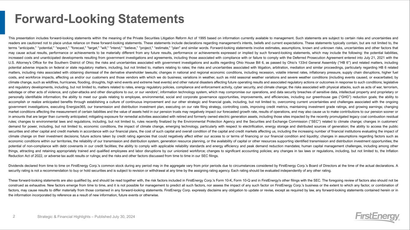 FirstEnergy’s Strategic and Financial Highlights presentation is posted on the company’s Investor Information website – www.firstenergycorp.com/ir. It can be accessed through the Second Quarter 2024 Financial Results link. Important information may be disseminated initially or exclusively via the company’s Investor Information website; investors should consult the site to access this information.