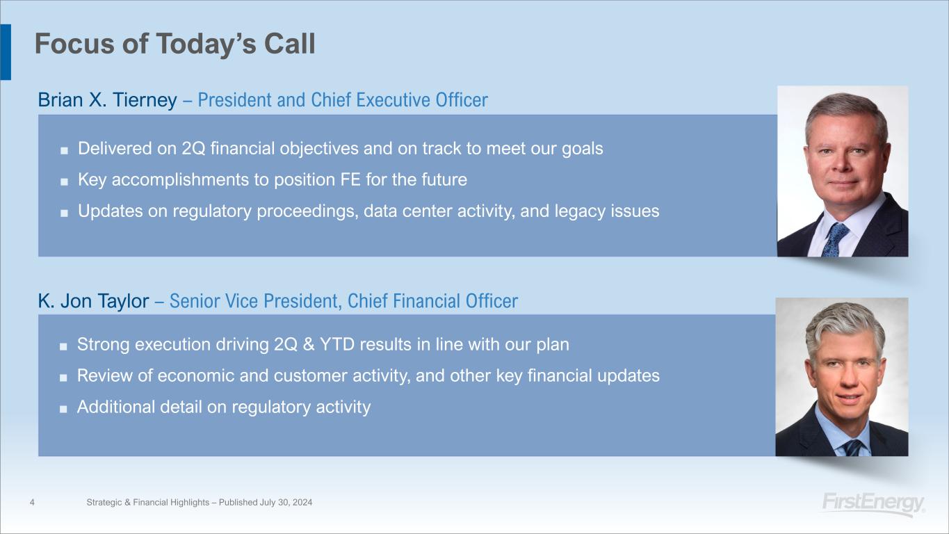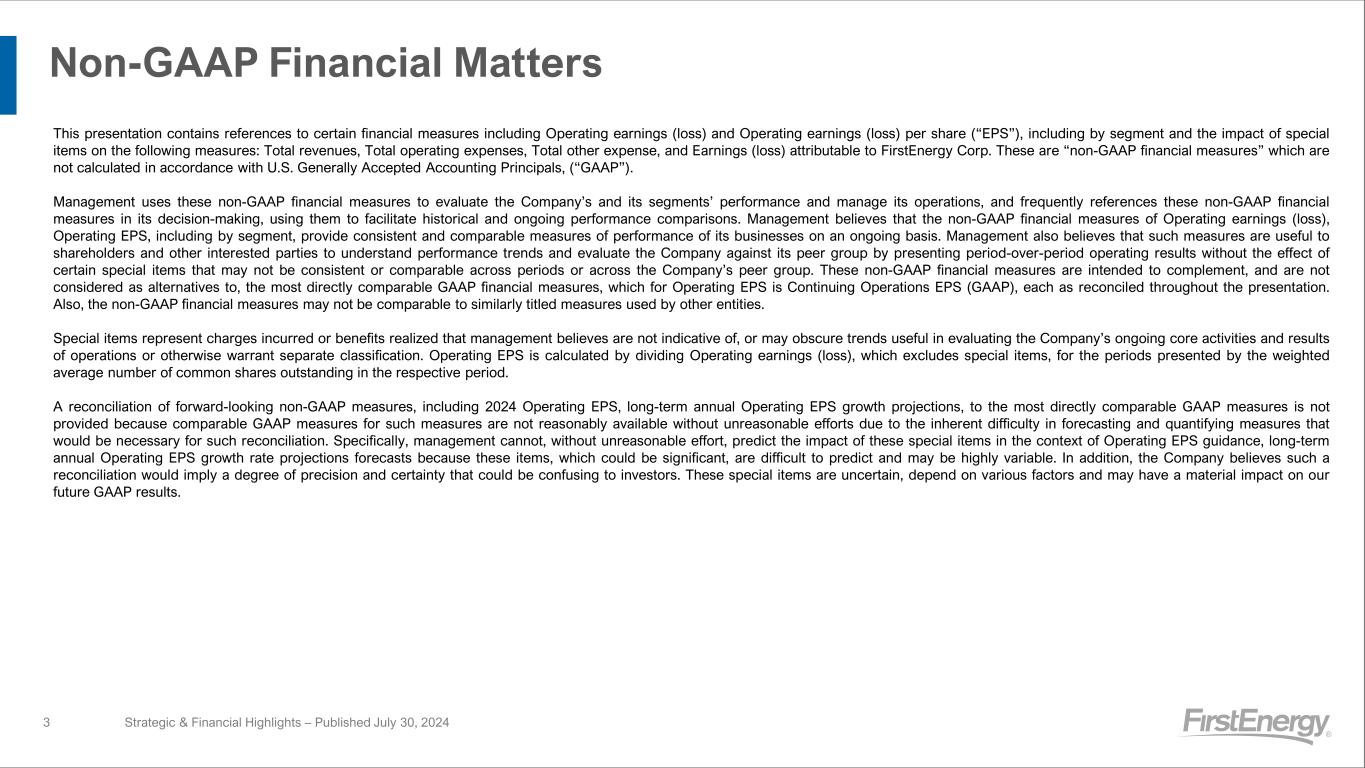 Non-GAAP Financial Matters Strategic & Financial Highlights – Published July 30, 20243 This presentation contains references to certain financial measures including Operating earnings (loss) and Operating earnings (loss) per share (“EPS”), including by segment and the impact of special items on the following measures: Total revenues, Total operating expenses, Total other expense, and Earnings (loss) attributable to FirstEnergy Corp. These are “non-GAAP financial measures” which are not calculated in accordance with U.S. Generally Accepted Accounting Principals, (“GAAP”). Management uses these non-GAAP financial measures to evaluate the Company’s and its segments’ performance and manage its operations, and frequently references these non-GAAP financial measures in its decision-making, using them to facilitate historical and ongoing performance comparisons. Management believes that the non-GAAP financial measures of Operating earnings (loss), Operating EPS, including by segment, provide consistent and comparable measures of performance of its businesses on an ongoing basis. Management also believes that such measures are useful to shareholders and other interested parties to understand performance trends and evaluate the Company against its peer group by presenting period-over-period operating results without the effect of certain special items that may not be consistent or comparable across periods or across the Company’s peer group. These non-GAAP financial measures are intended to complement, and are not considered as alternatives to, the most directly comparable GAAP financial measures, which for Operating EPS is Continuing Operations EPS (GAAP), each as reconciled throughout the presentation. Also, the non-GAAP financial measures may not be comparable to similarly titled measures used by other entities. Special items represent charges incurred or benefits realized that management believes are not indicative of, or may obscure trends useful in evaluating the Company’s ongoing core activities and results of operations or otherwise warrant separate classification. Operating EPS is calculated by dividing Operating earnings (loss), which excludes special items, for the periods presented by the weighted average number of common shares outstanding in the respective period. A reconciliation of forward-looking non-GAAP measures, including 2024 Operating EPS, long-term annual Operating EPS growth projections, to the most directly comparable GAAP measures is not provided because comparable GAAP measures for such measures are not reasonably available without unreasonable efforts due to the inherent difficulty in forecasting and quantifying measures that would be necessary for such reconciliation. Specifically, management cannot, without unreasonable effort, predict the impact of these special items in the context of Operating EPS guidance, long-term annual Operating EPS growth rate projections forecasts because these items, which could be significant, are difficult to predict and may be highly variable. In addition, the Company believes such a reconciliation would imply a degree of precision and certainty that could be confusing to investors. These special items are uncertain, depend on various factors and may have a material impact on our future GAAP results.