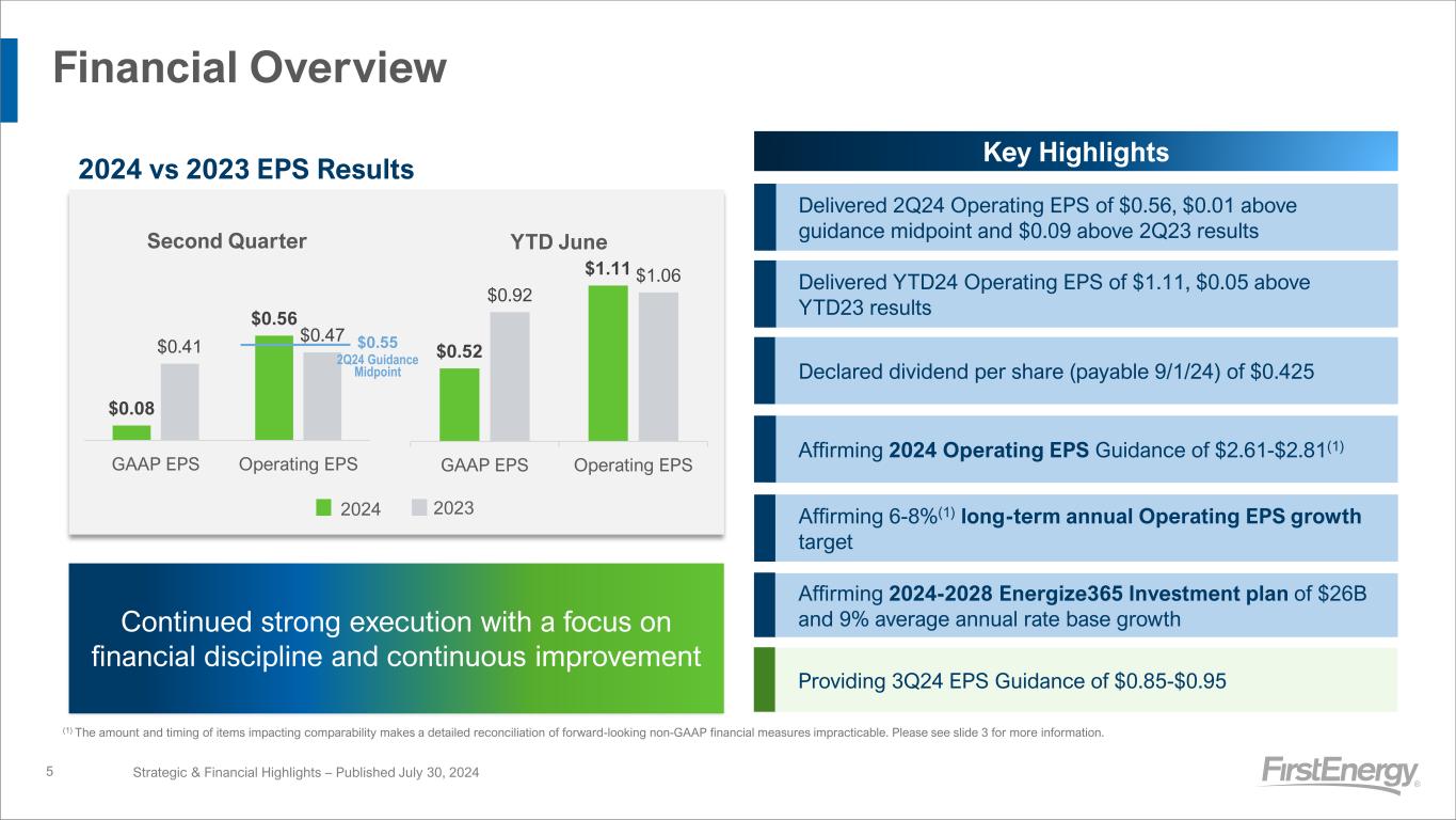 Focus of Today’s Call Strategic & Financial Highlights – Published July 30, 20244 Brian X. Tierney – President and Chief Executive Officer K. Jon Taylor – Senior Vice President, Chief Financial Officer ■ Delivered on 2Q financial objectives and on track to meet our goals ■ Key accomplishments to position FE for the future ■ Updates on regulatory proceedings, data center activity, and legacy issues ■ Strong execution driving 2Q & YTD results in line with our plan ■ Review of economic and customer activity, and other key financial updates ■ Additional detail on regulatory activity