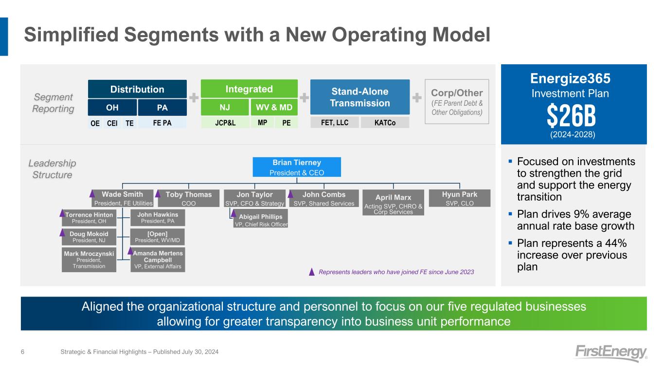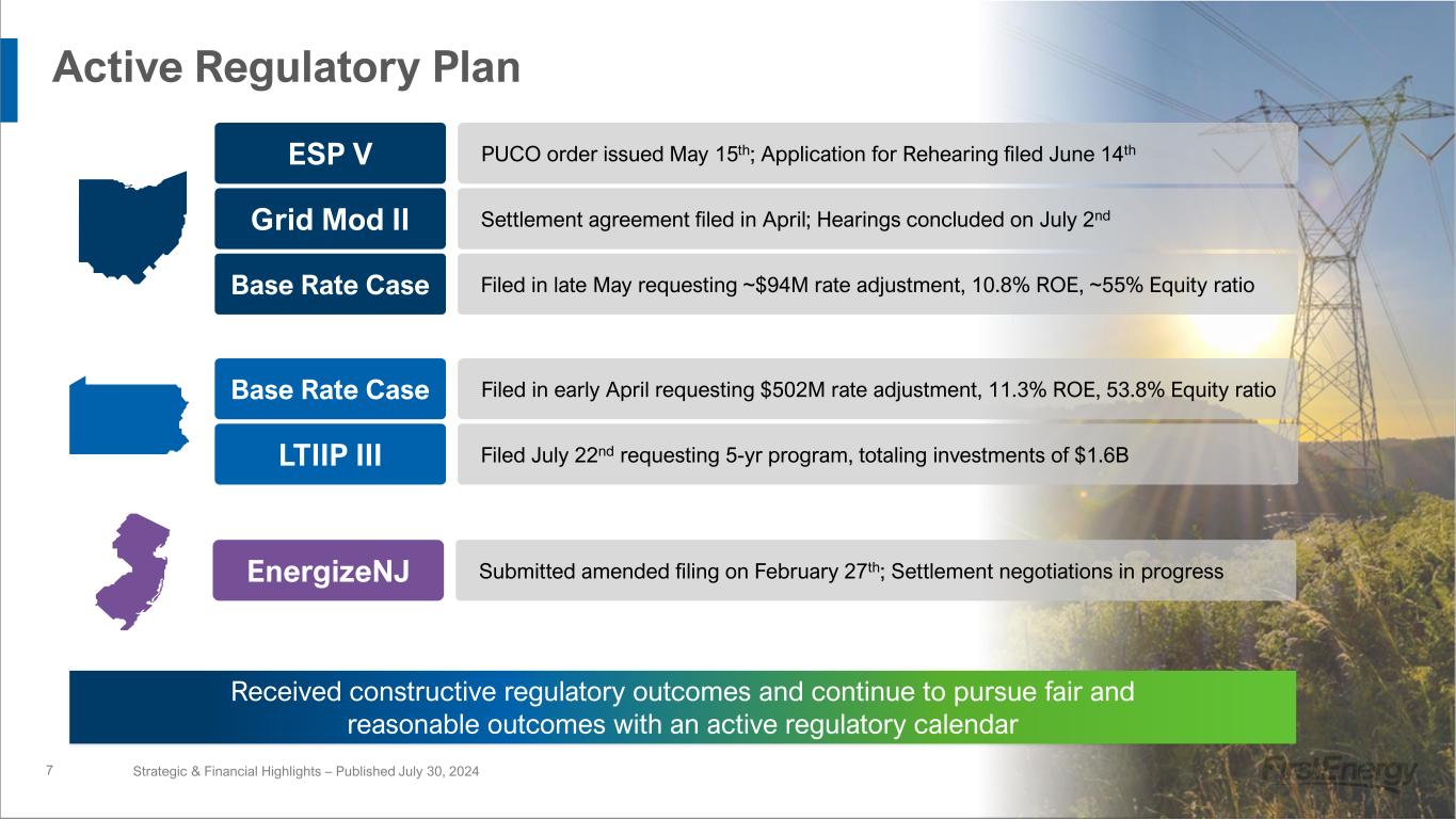 Brian Tierney President & CEO Wade Smith President, FE Utilities Torrence Hinton President, OH John Hawkins President, PA Doug Mokoid President, NJ [Open] President, WV/MD Mark Mroczynski President, Transmission Amanda Mertens Campbell VP, External Affairs Toby Thomas COO Jon Taylor SVP, CFO & Strategy Abigail Phillips VP, Chief Risk Officer John Combs SVP, Shared Services April Marx Acting SVP, CHRO & Corp Services Hyun Park SVP, CLO Simplified Segments with a New Operating Model Strategic & Financial Highlights – Published July 30, 20246 Stand-Alone Transmission Distribution Integrated Corp/Other (FE Parent Debt & Other Obligations) PAOH CEIOE TE FE PA WV & MDNJ JCP&L PEMP FET, LLC KATCo Represents leaders who have joined FE since June 2023 $26B Energize365 Investment Plan (2024-2028) ▪ Focused on investments to strengthen the grid and support the energy transition ▪ Plan drives 9% average annual rate base growth ▪ Plan represents a 44% increase over previous plan Aligned the organizational structure and personnel to focus on our five regulated businesses allowing for greater transparency into business unit performance Segment Reporting Leadership Structure