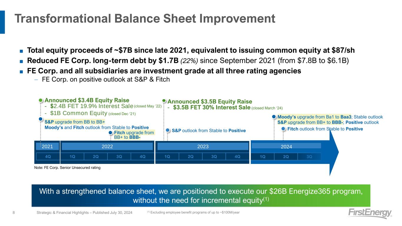 Active Regulatory Plan 7 Strategic & Financial Highlights – Published July 30, 2024 ESP V Grid Mod II Base Rate Case PUCO order issued May 15th; Application for Rehearing filed June 14th Settlement agreement filed in April; Hearings concluded on July 2nd Filed in late May requesting ~$94M rate adjustment, 10.8% ROE, ~55% Equity ratio Base Rate Case LTIIP III EnergizeNJ Filed in early April requesting $502M rate adjustment, 11.3% ROE, 53.8% Equity ratio Filed July 22nd requesting 5-yr program, totaling investments of $1.6B Submitted amended filing on February 27th; Settlement negotiations in progress Received constructive regulatory outcomes and continue to pursue fair and reasonable outcomes with an active regulatory calendar