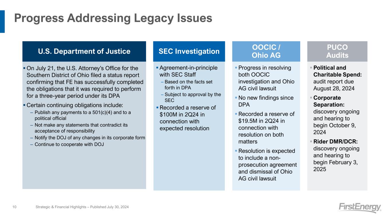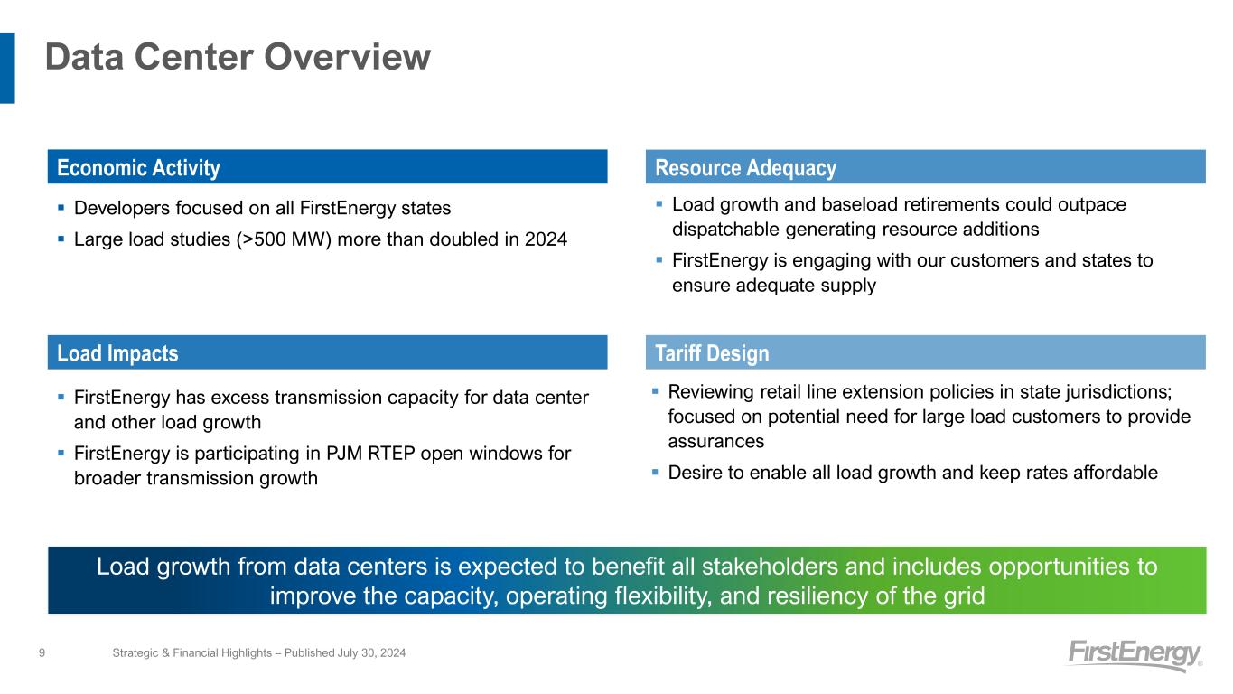 Economic Activity ▪ Developers focused on all FirstEnergy states ▪ Large load studies (>500 MW) more than doubled in 2024 Data Center Overview Strategic & Financial Highlights – Published July 30, 20249 ▪ FirstEnergy has excess transmission capacity for data center and other load growth ▪ FirstEnergy is participating in PJM RTEP open windows for broader transmission growth ▪ Reviewing retail line extension policies in state jurisdictions; focused on potential need for large load customers to provide assurances ▪ Desire to enable all load growth and keep rates affordable Load Impacts Tariff Design Resource Adequacy ▪ Load growth and baseload retirements could outpace dispatchable generating resource additions ▪ FirstEnergy is engaging with our customers and states to ensure adequate supply Load growth from data centers is expected to benefit all stakeholders and includes opportunities to improve the capacity, operating flexibility, and resiliency of the grid