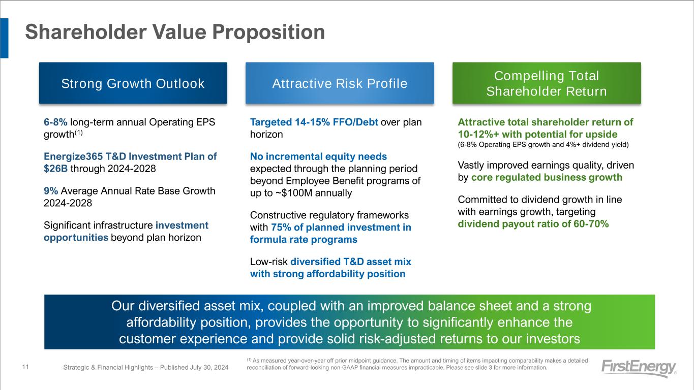 Progress Addressing Legacy Issues Strategic & Financial Highlights – Published July 30, 202410 U.S. Department of Justice ▪On July 21, the U.S. Attorney’s Office for the Southern District of Ohio filed a status report confirming that FE has successfully completed the obligations that it was required to perform for a three-year period under its DPA ▪Certain continuing obligations include: ‒ Publish any payments to a 501(c)(4) and to a political official ‒ Not make any statements that contradict its acceptance of responsibility ‒ Notify the DOJ of any changes in its corporate form ‒ Continue to cooperate with DOJ SEC Investigation ▪Agreement-in-principle with SEC Staff – Based on the facts set forth in DPA – Subject to approval by the SEC ▪Recorded a reserve of $100M in 2Q24 in connection with expected resolution OOCIC / Ohio AG ▪Progress in resolving both OOCIC investigation and Ohio AG civil lawsuit ▪No new findings since DPA ▪Recorded a reserve of $19.5M in 2Q24 in connection with resolution on both matters ▪Resolution is expected to include a non- prosecution agreement and dismissal of Ohio AG civil lawsuit PUCO Audits ▪Political and Charitable Spend: audit report due August 28, 2024 ▪Corporate Separation: discovery ongoing and hearing to begin October 9, 2024 ▪Rider DMR/DCR: discovery ongoing and hearing to begin February 3, 2025