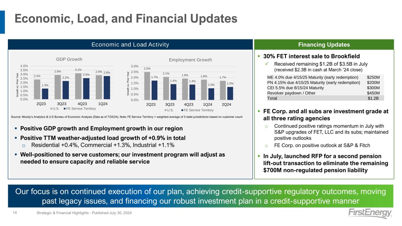 Delivering Financial Results YTD 2024 Earnings Summary – Segment View Strategic & Financial Highlights – Published July 30, 202413 Note: Reconciliations between GAAP Earnings and Operating (non-GAAP) earnings and detailed information is available in the Earnings Supplement section of the Strategic & Financial Highlights We remain on track in 2024 due to strong execution on our Energize365 capital investment program, solid financial discipline, and a culture of continuous improvement YTD Operating EPS Walk Dx $0.57 Int $0.26 Tx $0.35 Corp($0.12) Dx $0.52 Int $0.36 Tx $0.32 Corp($0.09) ▪ Distribution -$0.05: planned increase in operating expenses partially offset by the impact of higher customer demand and rate base growth ▪ Integrated +$0.10: implementation of new base rates, rate base growth, and the impact of higher customer demand, partially offset by a higher effective tax rate and higher operating expenses ▪ Stand-Alone Transmission -$0.03: impact of FET 30% sale (closed 3/25/24), partially offset by continued rate base growth ▪ Corporate +$0.03: impact of FET 30% sale and higher discrete tax benefits, partially offset by lower planned earnings from Signal Peak YTD24 GAAP EPS: $0.52/sh (vs. $0.92/sh YTD23) YTD24 Operating EPS: $1.11/sh (vs. $1.06/sh YTD23) Rates & Investments +$0.03 Customer Demand +$0.06 Operating Expenses -$0.10 Financing Costs -$0.01 All Other -$0.03 Rates & Investments +$0.14 Customer Demand +$0.05 Operating Expenses -$0.04 Financing Costs -$0.01 All Other -$0.04 Rates & Investments +$0.05 Financing Costs -$0.08 (includes -$0.06 impact from FET 30% sale) Financing Costs +$0.03 All Other +$0.00 (ETR +$0.06, Signal Peak -$0.06) Signal Peak -$0.06 (~$0.12 YTD23 vs. $0.06 in YTD24)