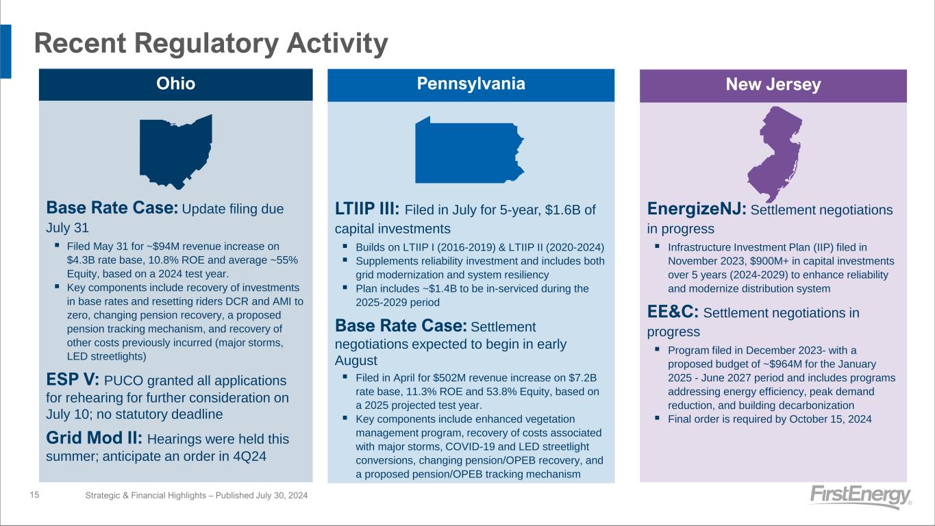 2.4% 2.9% 3.1% 2.9% 1.3% 2.2% 2.5% 2.8% 0.0% 0.5% 1.0% 1.5% 2.0% 2.5% 3.0% 3.5% 4.0% 2Q23 3Q23 4Q23 1Q24 GDP Growth U.S. FE Service Territory G ro w th v s . P ri o r Y e a r Economic, Load, and Financial Updates Strategic & Financial Highlights - Published July 30, 202414 Economic and Load Activity Financing Updates ▪ 30% FET interest sale to Brookfield ✓ Received remaining $1.2B of $3.5B in July (received $2.3B in cash at March ’24 close) ▪ FE Corp. and all subs are investment grade at all three rating agencies o Continued positive ratings momentum in July with S&P upgrades of FET, LLC and its subs; maintained positive outlooks o FE Corp. on positive outlook at S&P & Fitch ▪ In July, launched RFP for a second pension lift-out transaction to eliminate the remaining $700M non-regulated pension liability ME 4.0% due 4/15/25 Maturity (early redemption) $250M PN 4.15% due 4/15/25 Maturity (early redemption) $200M CEI 5.5% due 8/15/24 Maturity $300M Revolver paydown / Other $450M Total $1.2B Our focus is on continued execution of our plan, achieving credit-supportive regulatory outcomes, moving past legacy issues, and financing our robust investment plan in a credit-supportive manner Source: Moody’s Analytics & U.S Bureau of Economic Analysis (Data as of 7/25/24), Note: FE Service Territory = weighted average of 5 state jurisdictions based on customer count ▪ Positive GDP growth and Employment growth in our region ▪ Positive TTM weather-adjusted load growth of +0.9% in total o Residential +0.4%, Commercial +1.3%, Industrial +1.1% ▪ Well-positioned to serve customers; our investment program will adjust as needed to ensure capacity and reliable service 2.5% 2.1% 1.9% 1.8% 1.7%1.7% 1.4% 1.4% 1.0% 1.2% 0.0% 0.5% 1.0% 1.5% 2.0% 2.5% 3.0% 2Q23 3Q23 4Q23 1Q24 2Q24 Employment Growth U.S. FE Service Territory G ro w th v s . P ri o r Y e a r