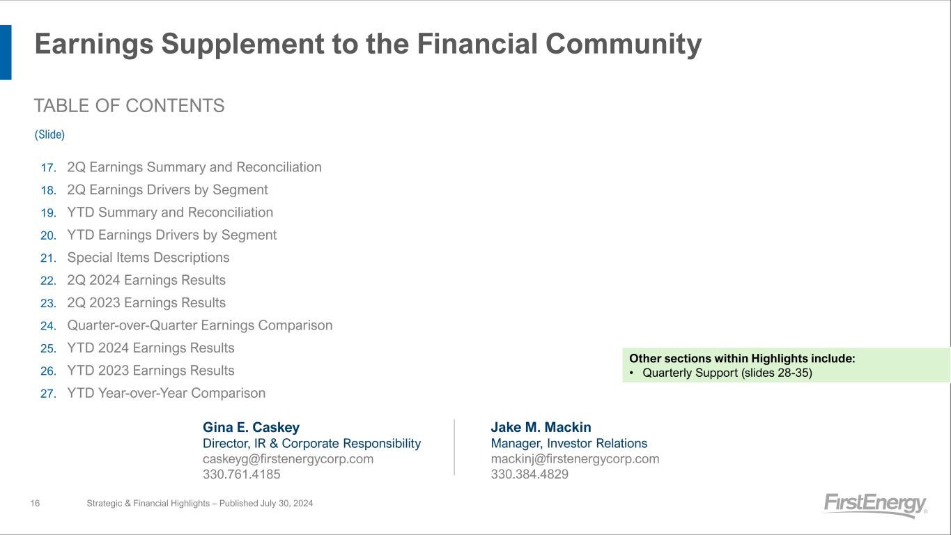 Earnings Supplement to the Financial Community 17. 2Q Earnings Summary and Reconciliation 18. 2Q Earnings Drivers by Segment 19. YTD Summary and Reconciliation 20. YTD Earnings Drivers by Segment 21. Special Items Descriptions 22. 2Q 2024 Earnings Results 23. 2Q 2023 Earnings Results 24. Quarter-over-Quarter Earnings Comparison 25. YTD 2024 Earnings Results 26. YTD 2023 Earnings Results 27. YTD Year-over-Year Comparison TABLE OF CONTENTS (Slide) Gina E. Caskey Director, IR & Corporate Responsibility caskeyg@firstenergycorp.com 330.761.4185 Jake M. Mackin Manager, Investor Relations mackinj@firstenergycorp.com 330.384.4829 Other sections within Highlights include: • Quarterly Support (slides 28-35) Strategic & Financial Highlights – Published July 30, 202416