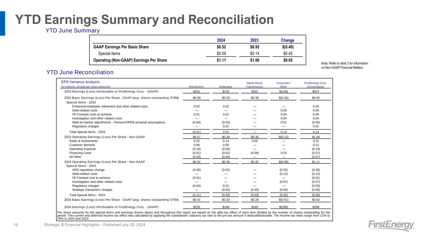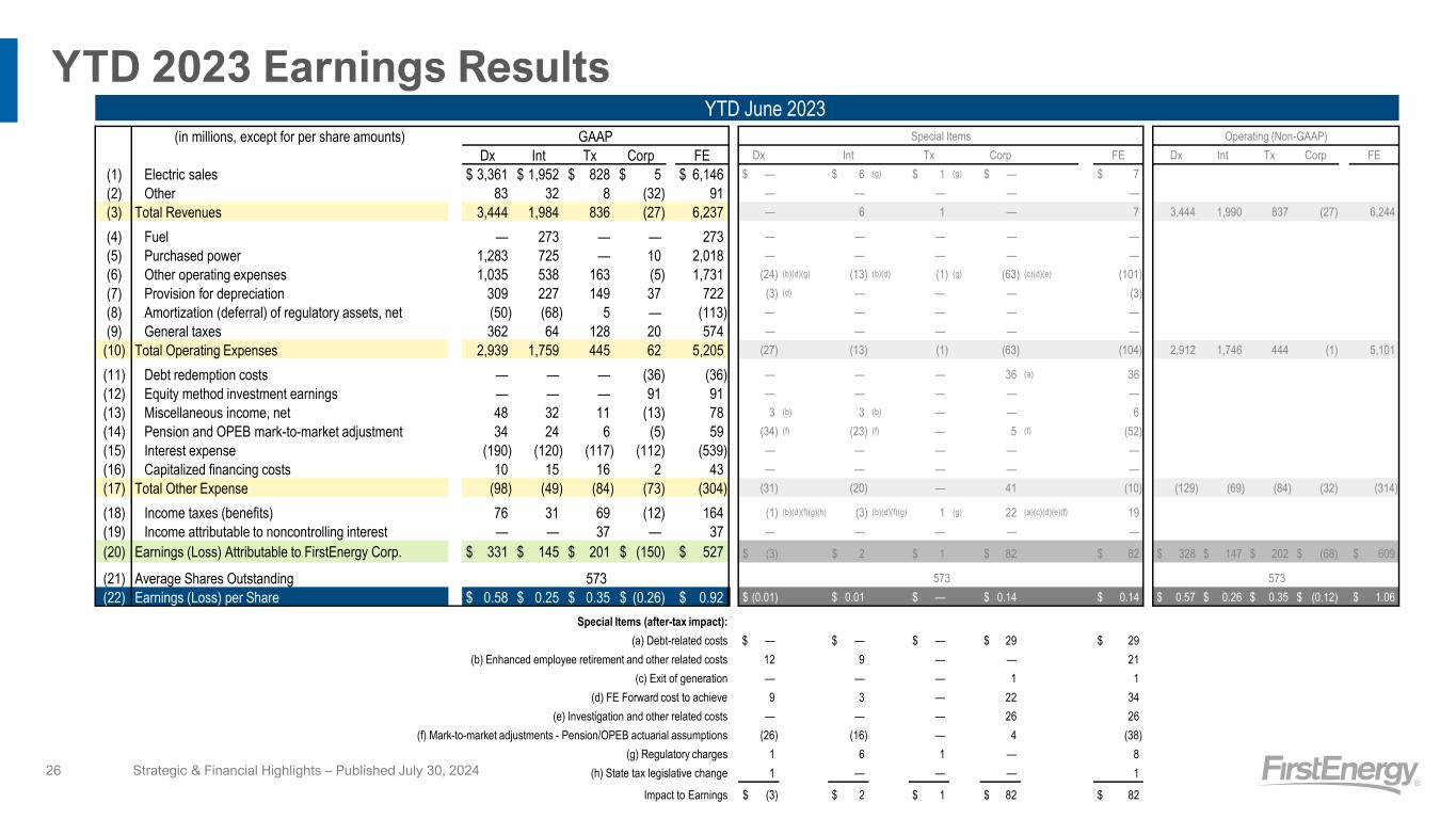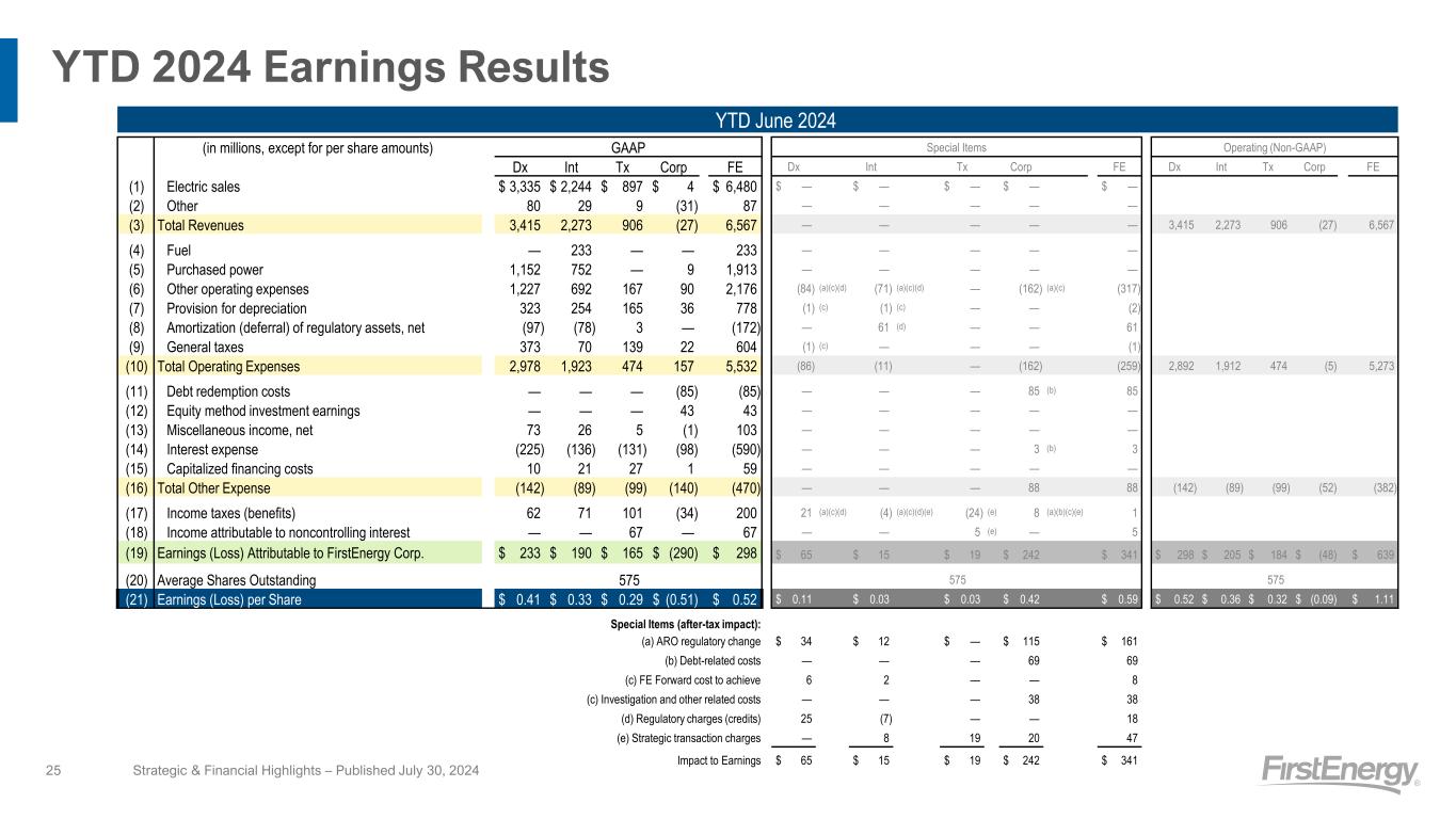 YTD 2024 Earnings Results Strategic & Financial Highlights – Published July 30, 202425 YTD June 2024 (in millions, except for per share amounts) GAAP Special Items Operating (Non-GAAP) Dx Int Tx Corp FE Dx Int Tx Corp FE Dx Int Tx Corp FE (1) Electric sales $ 3,335 $ 2,244 $ 897 $ 4 $ 6,480 $ — $ — $ — $ — $ — $ 3,335 $ 2,244 $ 897 $ 4 $ 6,480 (2) Other 80 29 9 (31) 87 — — — — — 80 29 9 (31) 87 (3) Total Revenues 3,415 2,273 906 (27) 6,567 — — — — — 3,415 2,273 906 (27) 6,567 (4) Fuel — 233 — — 233 — — — — — — 233 — — 233 (5) Purchased power 1,152 752 — 9 1,913 — — — — — 1,152 752 — 9 1,913 (6) Other operating expenses 1,227 692 167 90 2,176 (84) (a)(c)(d) (71) (a)(c)(d) — (162) (a)(c) (317) 1,143 621 167 (72) 1,859 (7) Provision for depreciation 323 254 165 36 778 (1) (c) (1) (c) — — (2) 322 253 165 36 776 (8) Amortization (deferral) of regulatory assets, net (97) (78) 3 — (172) — 61 (d) — — 61 (97) (17) 3 — (111) (9) General taxes 373 70 139 22 604 (1) (c) — — — (1) 372 70 139 22 603 (10) Total Operating Expenses 2,978 1,923 474 157 5,532 (86) (11) — (162) (259) 2,892 1,912 474 (5) 5,273 (11) Debt redemption costs — — — (85) (85) — — — 85 (b) 85 — — — — — (12) Equity method investment earnings — — — 43 43 — — — — — — — — 43 43 (13) Miscellaneous income, net 73 26 5 (1) 103 — — — — — 73 26 5 (1) 103 (14) Interest expense (225) (136) (131) (98) (590) — — — 3 (b) 3 (225) (136) (131) (95) (587) (15) Capitalized financing costs 10 21 27 1 59 — — — — — 10 21 27 1 59 (16) Total Other Expense (142) (89) (99) (140) (470) — — — 88 88 (142) (89) (99) (52) (382) (17) Income taxes (benefits) 62 71 101 (34) 200 21 (a)(c)(d) (4) (a)(c)(d)(e) (24) (e) 8 (a)(b)(c)(e) 1 83 67 77 (26) 201 (18) Income attributable to noncontrolling interest — — 67 — 67 — — 5 (e) — 5 — — 72 — 72 (19) Earnings (Loss) Attributable to FirstEnergy Corp. $ 233 $ 190 $ 165 $ (290) $ 298 $ 65 $ 15 $ 19 $ 242 $ 341 $ 298 $ 205 $ 184 $ (48) $ 639 (20) Average Shares Outstanding 575 575 575 (21) Earnings (Loss) per Share $ 0.41 $ 0.33 $ 0.29 $ (0.51) $ 0.52 $ 0.11 $ 0.03 $ 0.03 $ 0.42 $ 0.59 $ 0.52 $ 0.36 $ 0.32 $ (0.09) $ 1.11 Special Items (after-tax impact): (a) (a) ARO regulatory change $ 34 $ 12 $ — $ 115 $ 161 (b) (b) Debt-related costs — — — 69 69 (c) (c) FE Forward cost to achieve 6 2 — — 8 (c) (c) Investigation and other related costs — — — 38 38 (d) (d) Regulatory charges (credits) 25 (7) — — 18 (e) (e) Strategic transaction charges — 8 19 20 47 Impact to Earnings $ 65 $ 15 $ 19 $ 242 $ 341