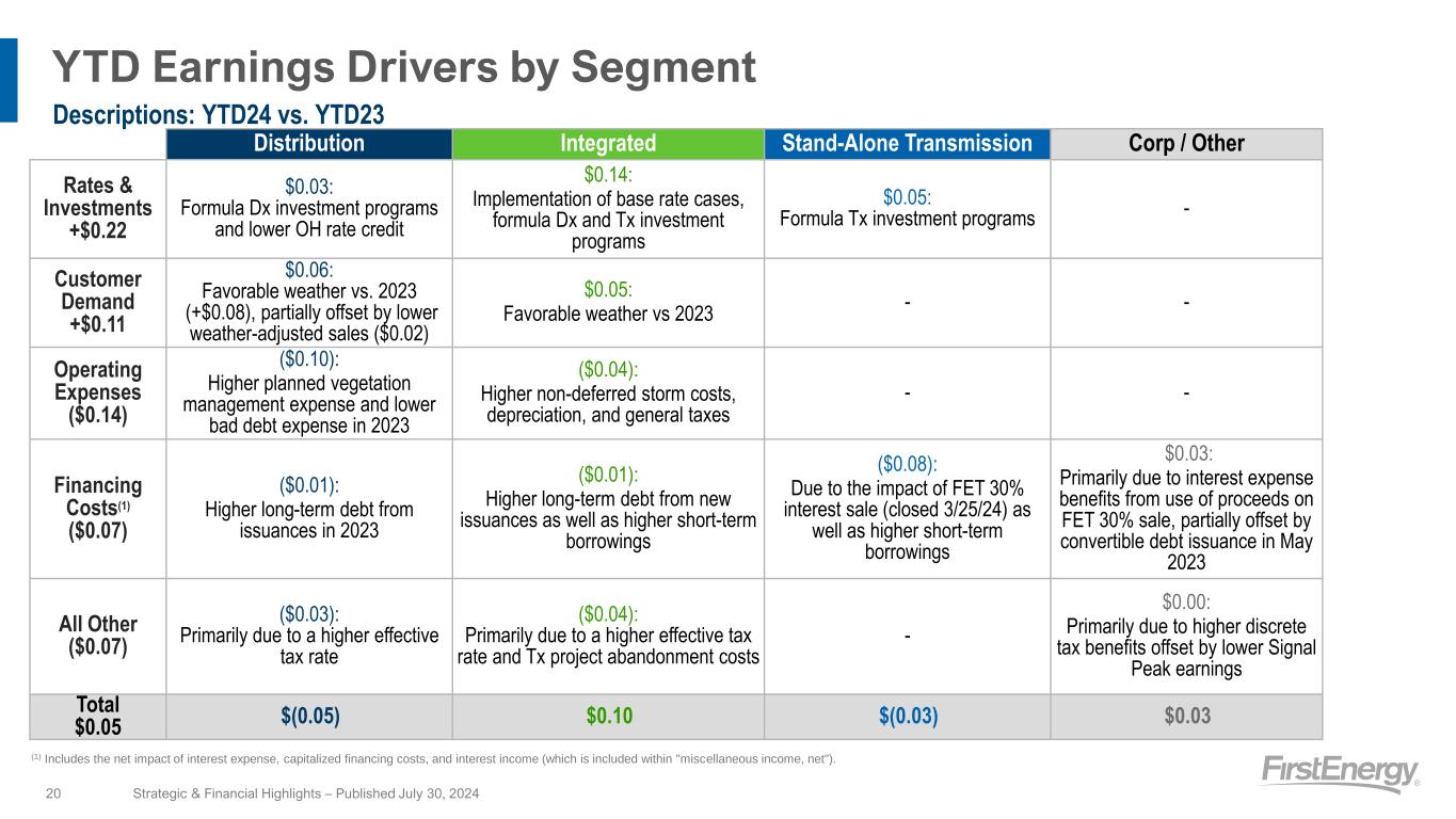 YTD Earnings Summary and Reconciliation Strategic & Financial Highlights – Published July 30, 202419 Strategic & Financial Highlights – Published July 30, 2024 EPS Variance Analysis Stand-Alone Corporate / FirstEnergy Corp. (in millions, except per share amounts) Distribution Integrated Transmission Other Consolidated 2023 Earnings (Loss) Attributable to FirstEnergy Corp. - (GAAP) $331 $145 $201 $(150) $527 2023 Basic Earnings (Loss) Per Share - GAAP (avg. shares outstanding 573M) $0.58 $0.25 $0.35 $(0.26) $0.92 Special Items - 2023 Enhanced employee retirement and other related costs 0.02 0.02 — — 0.04 Debt-related costs — — — 0.05 0.05 FE Forward costs to achieve 0.01 0.01 — 0.04 0.06 Investigation and other related costs — — — 0.04 0.04 Mark-to-market adjustments - Pension/OPEB actuarial assumptions (0.04) (0.03) — 0.01 (0.06) Regulatory charges — 0.01 — — 0.01 Total Special Items - 2023 (0.01) 0.01 — 0.14 0.14 2023 Operating Earnings (Loss) Per Share - Non-GAAP $0.57 $0.26 $0.35 $(0.12) $1.06 Rates & Investments 0.03 0.14 0.05 — 0.22 Customer demand 0.06 0.05 — — 0.11 Operating Expense (0.10) (0.04) — — (0.14) Financing Costs (0.01) (0.01) (0.08) 0.03 (0.07) All Other (0.03) (0.04) — — (0.07) 2024 Operating Earnings (Loss) Per Share - Non-GAAP $0.52 $0.36 $0.32 $(0.09) $1.11 Special Items - 2024 ARO regulatory change (0.06) (0.02) — (0.20) (0.28) Debt-related costs — — — (0.12) (0.12) FE Forward cost to achieve (0.01) — — — (0.01) Investigation and other related costs — — — (0.07) (0.07) Regulatory charges (0.04) 0.01 — — (0.03) Strategic transaction charges — (0.02) (0.03) (0.03) (0.08) Total Special Items - 2024 (0.11) (0.03) (0.03) (0.42) (0.59) 2024 Basic Earnings (Loss) Per Share - GAAP (avg. shares outstanding 575M) $0.41 $0.33 $0.29 $(0.51) $0.52 2024 Earnings (Loss) Attributable to FirstEnergy Corp. - (GAAP) $233 $190 $165 $(290) $298 Per share amounts for the special items and earnings drivers above and throughout this report are based on the after-tax effect of each item divided by the number of shares outstanding for the period. The current and deferred income tax effect was calculated by applying the subsidiaries' statutory tax rate to the pre-tax amount if deductible/taxable. The income tax rates range from 21% to 29% in 2024 and 2023. YTD June Summary YTD June Reconciliation 2024 2023 Change GAAP Earnings Per Basic Share $0.52 $0.92 $(0.40) Special Items $0.59 $0.14 $0.45 Operating (Non-GAAP) Earnings Per Share $1.11 $1.06 $0.05 Note: Refer to slide 3 for information on Non-GAAP Financial Matters.