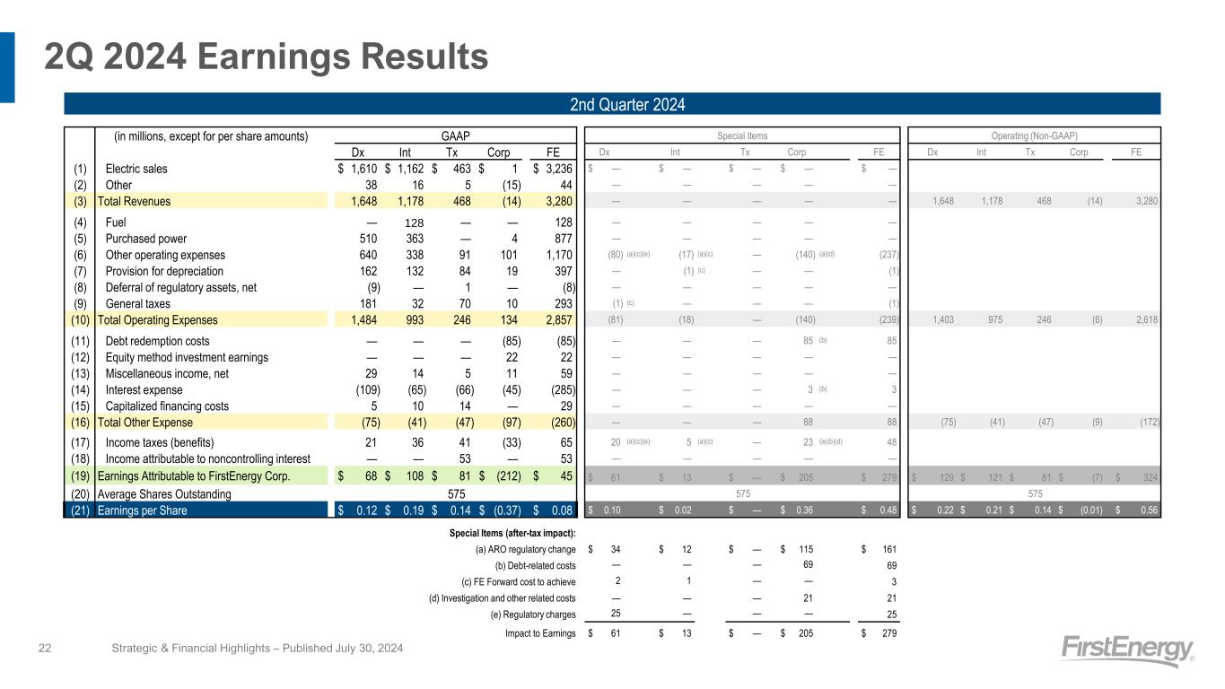 2Q 2024 Earnings Results Strategic & Financial Highlights – Published July 30, 202422 2nd Quarter 2024 (in millions, except for per share amounts) GAAP Special Items Operating (Non-GAAP) Dx Int Tx Corp FE Dx Int Tx Corp FE Dx Int Tx Corp FE (1) Electric sales $ 1,610 $ 1,162 $ 463 $ 1 $ 3,236 $ — $ — $ — $ — $ — $ 1,610 $ 1,162 $ 463 $ 1 $ 3,236 (2) Other 38 16 5 (15) 44 — — — — — 38 16 5 (15) 44 (3) Total Revenues 1,648 1,178 468 (14) 3,280 — — — — — 1,648 1,178 468 (14) 3,280 (4) Fuel — 128 — — 128 — — — — — — 128 — — 128 (5) Purchased power 510 363 — 4 877 — — — — — 510 363 — 4 877 (6) Other operating expenses 640 338 91 101 1,170 (80) (a)(c)(e) (17) (a)(c) — (140) (a)(d) (237) 560 321 91 (39) 933 (7) Provision for depreciation 162 132 84 19 397 — (1) (c) — — (1) 162 131 84 19 396 (8) Deferral of regulatory assets, net (9) — 1 — (8) — — — — — (9) — 1 — (8) (9) General taxes 181 32 70 10 293 (1) (c) — — — (1) 180 32 70 10 292 (10) Total Operating Expenses 1,484 993 246 134 2,857 (81) (18) — (140) (239) 1,403 975 246 (6) 2,618 (11) Debt redemption costs — — — (85) (85) — — — 85 (b) 85 — — — — — (12) Equity method investment earnings — — — 22 22 — — — — — — — — 22 22 (13) Miscellaneous income, net 29 14 5 11 59 — — — — — 29 14 5 11 59 (14) Interest expense (109) (65) (66) (45) (285) — — — 3 (b) 3 (109) (65) (66) (42) (282) (15) Capitalized financing costs 5 10 14 — 29 — — — — — 5 10 14 — 29 (16) Total Other Expense (75) (41) (47) (97) (260) — — — 88 88 (75) (41) (47) (9) (172) (17) Income taxes (benefits) 21 36 41 (33) 65 20 (a)(c)(e) 5 (a)(c) — 23 (a)(b)(d) 48 41 41 41 (10) 113 (18) Income attributable to noncontrolling interest — — 53 — 53 — — — — — — — 53 — 53 (19) Earnings Attributable to FirstEnergy Corp. $ 68 $ 108 $ 81 $ (212) $ 45 $ 61 $ 13 $ — $ 205 $ 279 $ 129 $ 121 $ 81 $ (7) $ 324 (20) Average Shares Outstanding 575 575 575 (21) Earnings per Share $ 0.12 $ 0.19 $ 0.14 $ (0.37) $ 0.08 $ 0.10 $ 0.02 $ — $ 0.36 $ 0.48 $ 0.22 $ 0.21 $ 0.14 $ (0.01) $ 0.56 Special Items (after-tax impact): (a) (a) ARO regulatory change $ 34 $ 12 $ — $ 115 $ 161 (b) (b) Debt-related costs — — — 69 69 (c) (c) FE Forward cost to achieve 2 1 — — 3 (d) (d) Investigation and other related costs — — — 21 21 (e) (e) Regulatory charges 25 — — — 25 Impact to Earnings $ 61 $ 13 $ — $ 205 $ 279