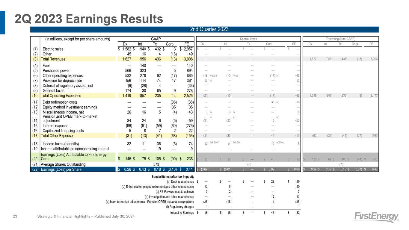 2Q 2023 Earnings Results Strategic & Financial Highlights – Published July 30, 202423 2nd Quarter 2023 (in millions, except for per share amounts) GAAP Special Items Operating (Non-GAAP) Dx Int Tx Corp FE Dx Int Tx Corp FE Dx Int Tx Corp FE (1) Electric sales $ 1,582 $ 940 $ 432 $ 3 $ 2,957 $ — $ — $ — $ — $ — $ 1,582 $ 940 $ 432 $ 3 $ 2,957 (2) Other 45 16 4 (16) 49 — — — — — 45 16 4 (16) 49 (3) Total Revenues 1,627 956 436 (13) 3,006 — — — — — 1,627 956 436 (13) 3,006 (4) Fuel — 140 — — 140 — — — — — — 140 — — 140 (5) Purchased power 566 323 — 5 894 — — — — — 566 323 — 5 894 (6) Other operating expenses 532 278 92 (17) 885 (19) (b)(c)(f) (10) (b)(c) — (17) (d) (46) 513 268 92 (34) 839 (7) Provision for depreciation 156 114 74 17 361 (2) (c) — — — (2) 154 114 74 17 359 (8) Deferral of regulatory assets, net (9) (28) 4 — (33) — — — — — (9) (28) 4 — (33) (9) General taxes 174 30 65 9 278 — — — — — 174 30 65 9 278 (10) Total Operating Expenses 1,419 857 235 14 2,525 (21) (10) — (17) (48) 1,398 847 235 (3) 2,477 (11) Debt redemption costs — — — (36) (36) — — — 36 (a) 36 — — — — — (12) Equity method investment earnings — — — 35 35 — — — — — — — — 35 35 (13) Miscellaneous income, net 26 16 5 (4) 43 3 (b) 3 (b) — — 6 29 19 5 (4) 49 (14) Pension and OPEB mark-to-market adjustment 34 24 6 (5) 59 (34) (e) (23) (e) — 5 (e) (52) — 1 6 — 7 (15) Interest expense (96) (61) (59) (60) (276) — — — — — (96) (61) (59) (60) (276) (16) Capitalized financing costs 5 8 7 2 22 — — — — — 5 8 7 2 22 (17) Total Other Expense (31) (13) (41) (68) (153) (31) (20) — 41 (10) (62) (33) (41) (27) (163) (18) Income taxes (benefits) 32 11 36 (5) 74 (2) (b)(c)(e)(f ) (4) (b)(c)(e) — 12 (a)(d)(e) 6 30 7 36 7 80 (19) Income attributable to noncontrolling interest — — 19 — 19 — — — — — — — 19 — 19 (20) Earnings (Loss) Attributable to FirstEnergy Corp. $ 145 $ 75 $ 105 $ (90) $ 235 $ (8) $ (6) $ — $ 46 $ 32 $ 137 $ 69 $ 105 $ (44) $ 267 (21) Average Shares Outstanding 573 573 573 (22) Earnings (Loss) per Share $ 0.26 $ 0.13 $ 0.18 $ (0.16) $ 0.41 $ (0.02) $ (0.01) $ — $ 0.09 $ 0.06 $ 0.24 $ 0.12 $ 0.18 $ (0.07) $ 0.47 Special Items (after-tax impact): (a) (a) Debt-related costs $ — $ — $ — $ 29 $ 29 (b) (b) Enhanced employee retirement and other related costs 12 8 — — 20 (c) (c) FE Forward cost to achieve 5 2 — — 7 (d) (d) Investigation and other related costs — — — 13 13 (e) (e) Mark-to-market adjustments - Pension/OPEB actuarial assumptions (26) (16) — 4 (38) (f) (f) Regulatory charges 1 — — — 1 Impact to Earnings $ (8) $ (6) $ — $ 46 $ 32