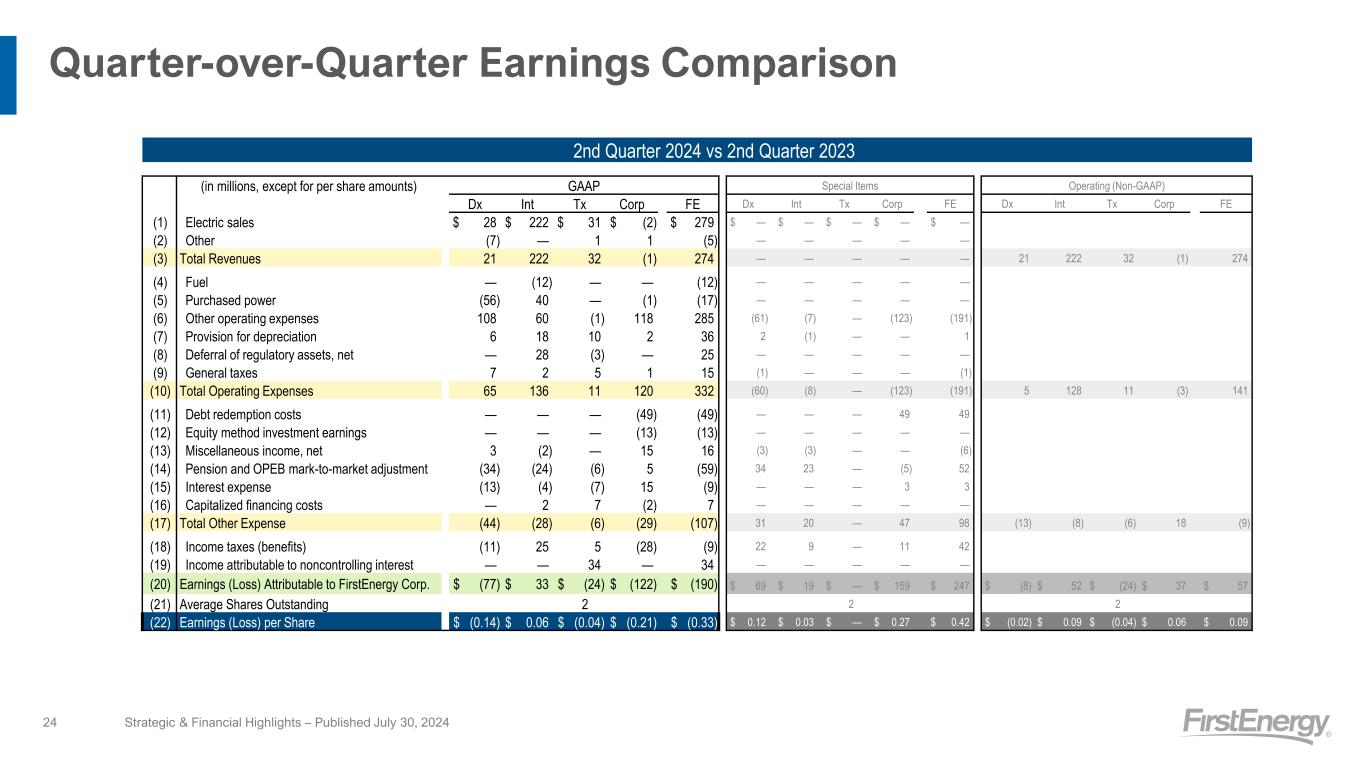 Quarter-over-Quarter Earnings Comparison Strategic & Financial Highlights – Published July 30, 202424 2nd Quarter 2024 vs 2nd Quarter 2023 (in millions, except for per share amounts) GAAP Special Items Operating (Non-GAAP) Dx Int Tx Corp FE Dx Int Tx Corp FE Dx Int Tx Corp FE (1) Electric sales $ 28 $ 222 $ 31 $ (2) $ 279 $ — $ — $ — $ — $ — $ 28 $ 222 $ 31 $ (2) $ 279 (2) Other (7) — 1 1 (5) — — — — — (7) — 1 1 (5) (3) Total Revenues 21 222 32 (1) 274 — — — — — 21 222 32 (1) 274 (4) Fuel — (12) — — (12) — — — — — — (12) — — (12) (5) Purchased power (56) 40 — (1) (17) — — — — — (56) 40 — (1) (17) (6) Other operating expenses 108 60 (1) 118 285 (61) (7) — (123) (191) 47 53 (1) (5) 94 (7) Provision for depreciation 6 18 10 2 36 2 (1) — — 1 8 17 10 2 37 (8) Deferral of regulatory assets, net — 28 (3) — 25 — — — — — — 28 (3) — 25 (9) General taxes 7 2 5 1 15 (1) — — — (1) 6 2 5 1 14 (10) Total Operating Expenses 65 136 11 120 332 (60) (8) — (123) (191) 5 128 11 (3) 141 (11) Debt redemption costs — — — (49) (49) — — — 49 49 — — — — — (12) Equity method investment earnings — — — (13) (13) — — — — — — — — (13) (13) (13) Miscellaneous income, net 3 (2) — 15 16 (3) (3) — — (6) — (5) — 15 10 (14) Pension and OPEB mark-to-market adjustment (34) (24) (6) 5 (59) 34 23 — (5) 52 — (1) (6) — (7) (15) Interest expense (13) (4) (7) 15 (9) — — — 3 3 (13) (4) (7) 18 (6) (16) Capitalized financing costs — 2 7 (2) 7 — — — — — — 2 7 (2) 7 (17) Total Other Expense (44) (28) (6) (29) (107) 31 20 — 47 98 (13) (8) (6) 18 (9) (18) Income taxes (benefits) (11) 25 5 (28) (9) 22 9 — 11 42 11 34 5 (17) 33 (19) Income attributable to noncontrolling interest — — 34 — 34 — — — — — — — 34 — 34 (20) Earnings (Loss) Attributable to FirstEnergy Corp. $ (77) $ 33 $ (24) $ (122) $ (190) $ 69 $ 19 $ — $ 159 $ 247 $ (8) $ 52 $ (24) $ 37 $ 57 (21) Average Shares Outstanding 2 2 2 (22) Earnings (Loss) per Share $ (0.14) $ 0.06 $ (0.04) $ (0.21) $ (0.33) $ 0.12 $ 0.03 $ — $ 0.27 $ 0.42 $ (0.02) $ 0.09 $ (0.04) $ 0.06 $ 0.09