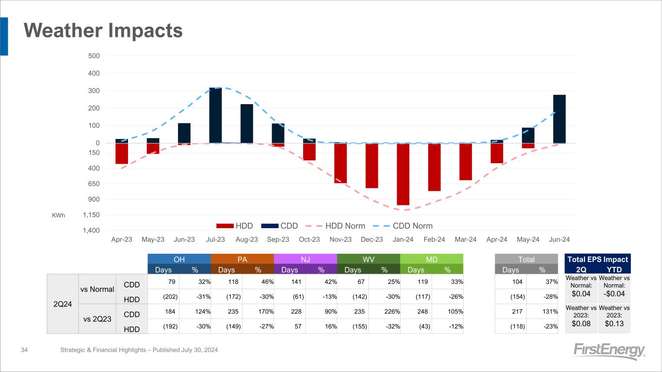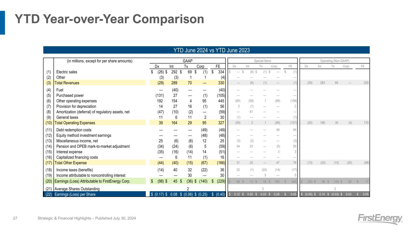 YTD Year-over-Year Comparison Strategic & Financial Highlights – Published July 30, 202427 YTD June 2024 vs YTD June 2023 (in millions, except for per share amounts) GAAP Special Items Operating (Non-GAAP) Dx Int Tx Corp FE Dx Int Tx Corp FE Dx Int Tx Corp FE (1) Electric sales $ (26) $ 292 $ 69 $ (1) $ 334 $ — $ (6) $ (1) $ — $ (1) $ (26) $ 286 $ 68 $ (1) $ 333 (2) Other (3) (3) 1 1 (4) — — — — — (3) (3) 1 1 (4) (3) Total Revenues (29) 289 70 — 330 — (6) (1) — (1) (29) 283 69 — 329 (4) Fuel — (40) — — (40) — — — — — — (40) — — (40) (5) Purchased power (131) 27 — (1) (105) — — — — — (131) 27 — (1) (105) (6) Other operating expenses 192 154 4 95 445 (60) (58) 1 (99) (158) 132 96 5 (4) 287 (7) Provision for depreciation 14 27 16 (1) 56 2 (1) — — 2 16 26 16 (1) 58 (8) Amortization (deferral) of regulatory assets, net (47) (10) (2) — (59) — 61 — — — (47) 51 (2) — (59) (9) General taxes 11 6 11 2 30 (1) — — — (1) 10 6 11 2 29 (10) Total Operating Expenses 39 164 29 95 327 (59) 2 1 (99) (157) (20) 166 30 (4) 170 (11) Debt redemption costs — — — (49) (49) — — — 49 49 — — — — — (12) Equity method investment earnings — — — (48) (48) — — — — — — — — (48) (48) (13) Miscellaneous income, net 25 (6) (6) 12 25 (3) (3) — — (3) 22 (9) (6) 12 22 (14) Pension and OPEB mark-to-market adjustment (34) (24) (6) 5 (59) 34 23 — (5) 29 — (1) (6) — (30) (15) Interest expense (35) (16) (14) 14 (51) — — — 3 3 (35) (16) (14) 17 (48) (16) Capitalized financing costs — 6 11 (1) 16 — — — — — — 6 11 (1) 16 (17) Total Other Expense (44) (40) (15) (67) (166) 31 20 — 47 78 (13) (20) (15) (20) (88) (18) Income taxes (benefits) (14) 40 32 (22) 36 22 (1) (25) (14) (17) 8 39 7 (36) 19 (19) Income attributable to noncontrolling interest — — 30 — 30 — — 5 — 5 — — 35 — 35 (20) Earnings (Loss) Attributable to FirstEnergy Corp. $ (98) $ 45 $ (36) $ (140) $ (229) $ 68 $ 13 $ 18 $ 160 $ 246 $ (30) $ 58 $ (18) $ 20 $ 17 (21) Average Shares Outstanding 2 2 2 (22) Earnings (Loss) per Share $ (0.17) $ 0.08 $ (0.06) $ (0.25) $ (0.40) $ 0.12 $ 0.02 $ 0.03 $ 0.28 $ 0.45 $ (0.05) $ 0.10 $ (0.03) $ 0.03 $ 0.05