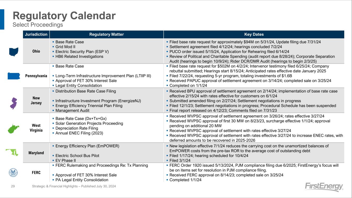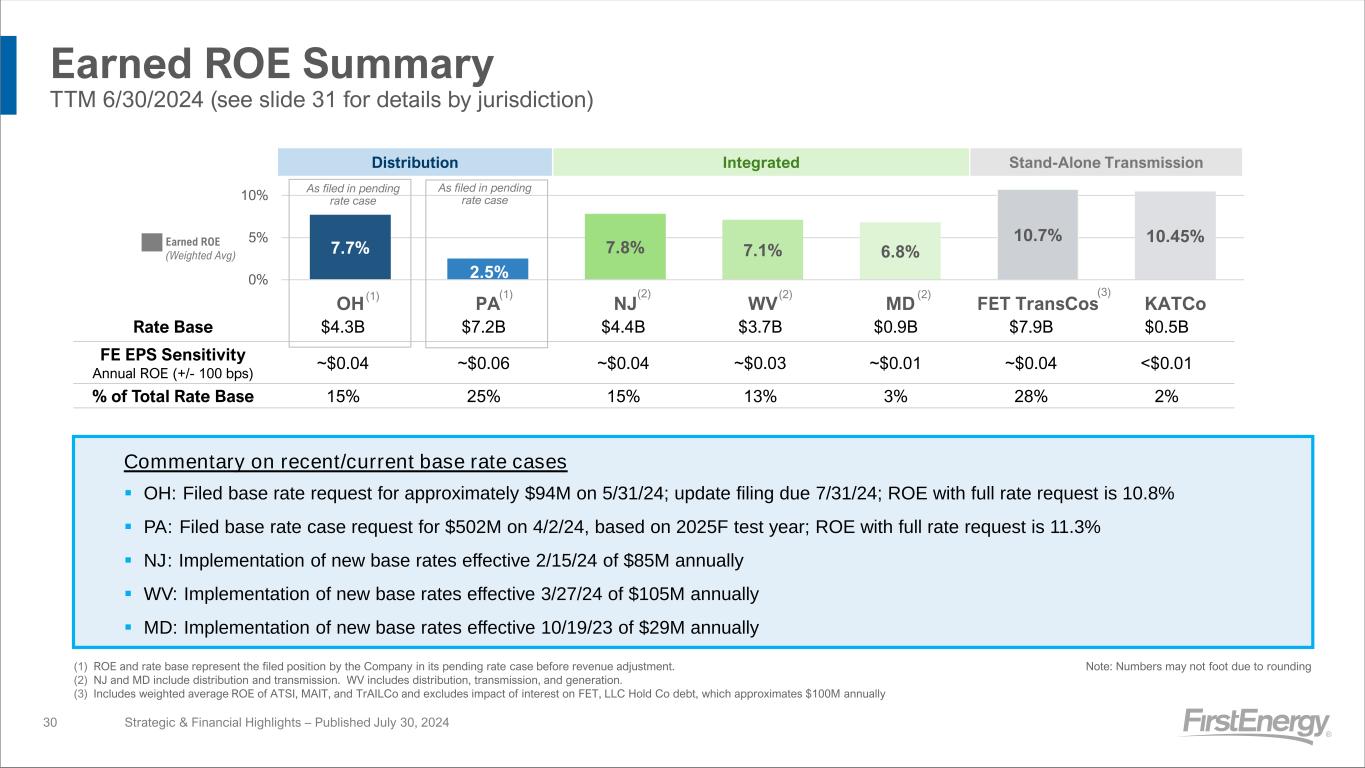 Jurisdiction Regulatory Matter Key Dates Ohio ▪ Base Rate Case ▪ Grid Mod II ▪ Electric Security Plan (ESP V) ▪ HB6 Related Investigations ▪ Filed base rate request for approximately $94M on 5/31/24, Update filing due 7/31/24 ▪ Settlement agreement filed 4/12/24; hearings concluded 7/2/24 ▪ PUCO order issued 5/15/24, Application for Rehearing filed 6/14/24 ▪ Review of Political and Charitable Spending (audit report due 8/28/24); Corporate Separation Audit (hearings to begin 10/9/24); Rider DCR/DMR Audit (hearings to begin 2/3/25) Pennsylvania ▪ Base Rate Case ▪ Long-Term Infrastructure Improvement Plan (LTIIP III) ▪ Approval of FET 30% Interest Sale ▪ Legal Entity Consolidation ▪ Filed base rate request for $502M on 4/2/24; Intervenor testimony filed 6/25/24; Company rebuttal submitted; Hearings start 8/15/24; Anticipated rates effective date January 2025 ▪ Filed 7/22/24, requesting 5-yr program, totaling investments of $1.6B ▪ Received PAPUC approval of settlement agreement on 3/14/24; completed sale on 3/25/24 ▪ Completed on 1/1/24 New Jersey ▪ Distribution Base Rate Case Filing ▪ Infrastructure Investment Program (EnergizeNJ) ▪ Energy Efficiency Triennial Plan Filing ▪ Management Audit ▪ Received BPU approval of settlement agreement on 2/14/24; implementation of base rate case effective 2/15/24 with rates effective for customers on 6/1/24 ▪ Submitted amended filing on 2/27/24; Settlement negotiations in progress ▪ Filed 12/1/23; Settlement negotiations in progress; Procedural Schedule has been suspended ▪ Final report released on 4/12/23; Comments filed on 7/31/23 West Virginia ▪ Base Rate Case (Dx+Tx+Gx) ▪ Solar Generation Projects Proceeding ▪ Depreciation Rate Filing ▪ Annual ENEC Filing (2023) ▪ Received WVPSC approval of settlement agreement on 3/26/24; rates effective 3/27/24 ▪ Received WVPSC approval of first 30 MW on 8/23/23, surcharge effective 1/1/24; approval pending on additional 20 MW ▪ Received WVPSC approval of settlement with rates effective 3/27/24 ▪ Received WVPSC approval of settlement with rates effective 3/27/24 to increase ENEC rates, with deferred amounts to be recovered in 2025-2026 Maryland ▪ Energy Efficiency Plan (EmPOWER) ▪ Electric School Bus Pilot ▪ EV Phase II ▪ New legislation effective 7/1/24 reduces the carrying cost on the unamortized balances of EmPOWER costs from the pre-tax ROR to the average cost of outstanding debt ▪ Filed 1/17/24; hearing scheduled for 10/4/24 ▪ Filed 3/1/24 FERC ▪ FERC Rulemaking and Proceedings Re: Tx Planning ▪ Approval of FET 30% Interest Sale ▪ PA Legal Entity Consolidation ▪ FERC Order 1920 issued 5/13/2024, PJM compliance filing due 6/2025; FirstEnergy’s focus will be on items set for resolution in PJM compliance filing. ▪ Received FERC approval on 8/14/23; completed sale on 3/25/24 ▪ Completed 1/1/24 Regulatory Calendar Select Proceedings 29 Strategic & Financial Highlights – Published July 30, 2024