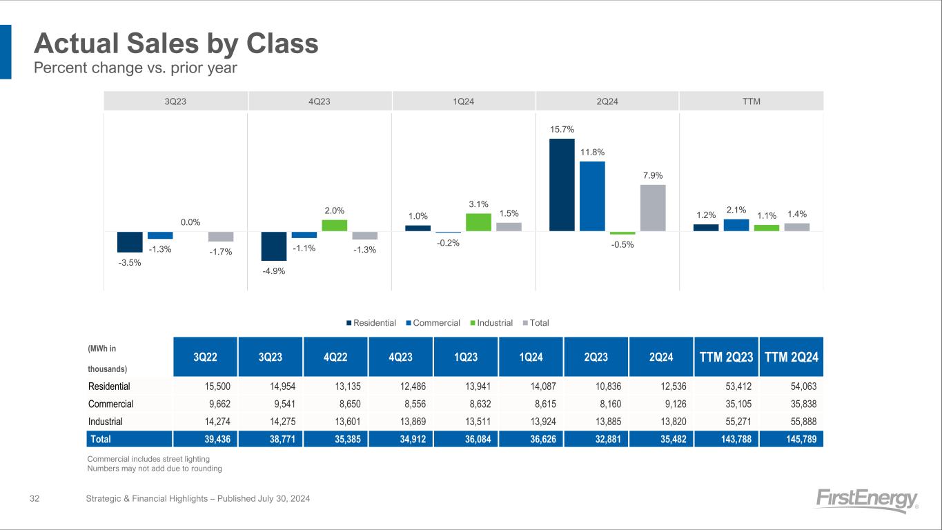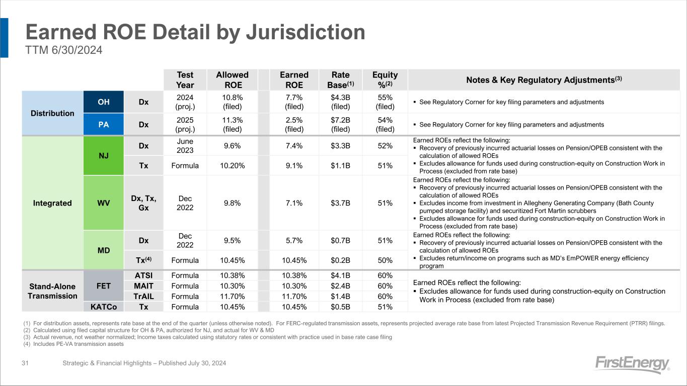Earned ROE (Weighted Avg) 7.7% 2.5% 7.8% 7.1% 6.8% 10.7% 10.45% 0% 5% 10% OH PA NJ WV MD FET TransCos KATCo Earned ROE Summary TTM 6/30/2024 (see slide 31 for details by jurisdiction) 30 Distribution Integrated Stand-Alone Transmission Rate Base $4.3B $7.2B $4.4B $3.7B $0.9B $7.9B $0.5B FE EPS Sensitivity Annual ROE (+/- 100 bps) ~$0.04 ~$0.06 ~$0.04 ~$0.03 ~$0.01 ~$0.04 <$0.01 % of Total Rate Base 15% 25% 15% 13% 3% 28% 2% As filed in pending rate case (1) Commentary on recent/current base rate cases ▪ OH: Filed base rate request for approximately $94M on 5/31/24; update filing due 7/31/24; ROE with full rate request is 10.8% ▪ PA: Filed base rate case request for $502M on 4/2/24, based on 2025F test year; ROE with full rate request is 11.3% ▪ NJ: Implementation of new base rates effective 2/15/24 of $85M annually ▪ WV: Implementation of new base rates effective 3/27/24 of $105M annually ▪ MD: Implementation of new base rates effective 10/19/23 of $29M annually (1) ROE and rate base represent the filed position by the Company in its pending rate case before revenue adjustment. (2) NJ and MD include distribution and transmission. WV includes distribution, transmission, and generation. (3) Includes weighted average ROE of ATSI, MAIT, and TrAILCo and excludes impact of interest on FET, LLC Hold Co debt, which approximates $100M annually (3)(2)(2) (2) Note: Numbers may not foot due to rounding Strategic & Financial Highlights – Published July 30, 2024 As filed in pending rate case (1)