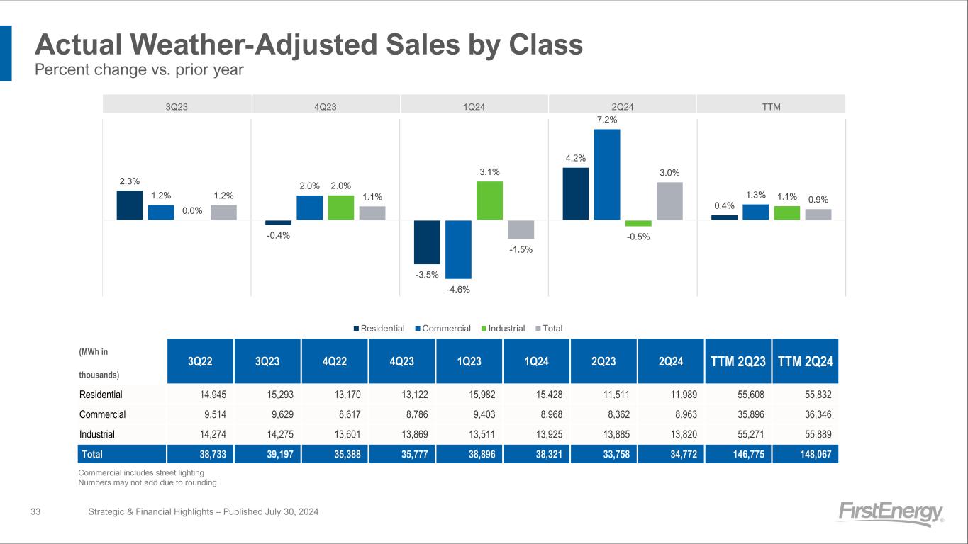 Actual Sales by Class Percent change vs. prior year 32 Commercial includes street lighting Numbers may not add due to rounding Strategic & Financial Highlights – Published July 30, 2024 -3.5% -4.9% 1.0% 15.7% 1.2% -1.3% -1.1% -0.2% 11.8% 2.1% 0.0% 2.0% 3.1% -0.5% 1.1% -1.7% -1.3% 1.5% 7.9% 1.4% 3Q23 4Q23 1Q24 2Q24 TTM Residential Commercial Industrial Total (MWh in 3Q22 3Q23 4Q22 4Q23 1Q23 1Q24 2Q23 2Q24 TTM 2Q23 TTM 2Q24 thousands) Residential 15,500 14,954 13,135 12,486 13,941 14,087 10,836 12,536 53,412 54,063 Commercial 9,662 9,541 8,650 8,556 8,632 8,615 8,160 9,126 35,105 35,838 Industrial 14,274 14,275 13,601 13,869 13,511 13,924 13,885 13,820 55,271 55,888 Total 39,436 38,771 35,385 34,912 36,084 36,626 32,881 35,482 143,788 145,789