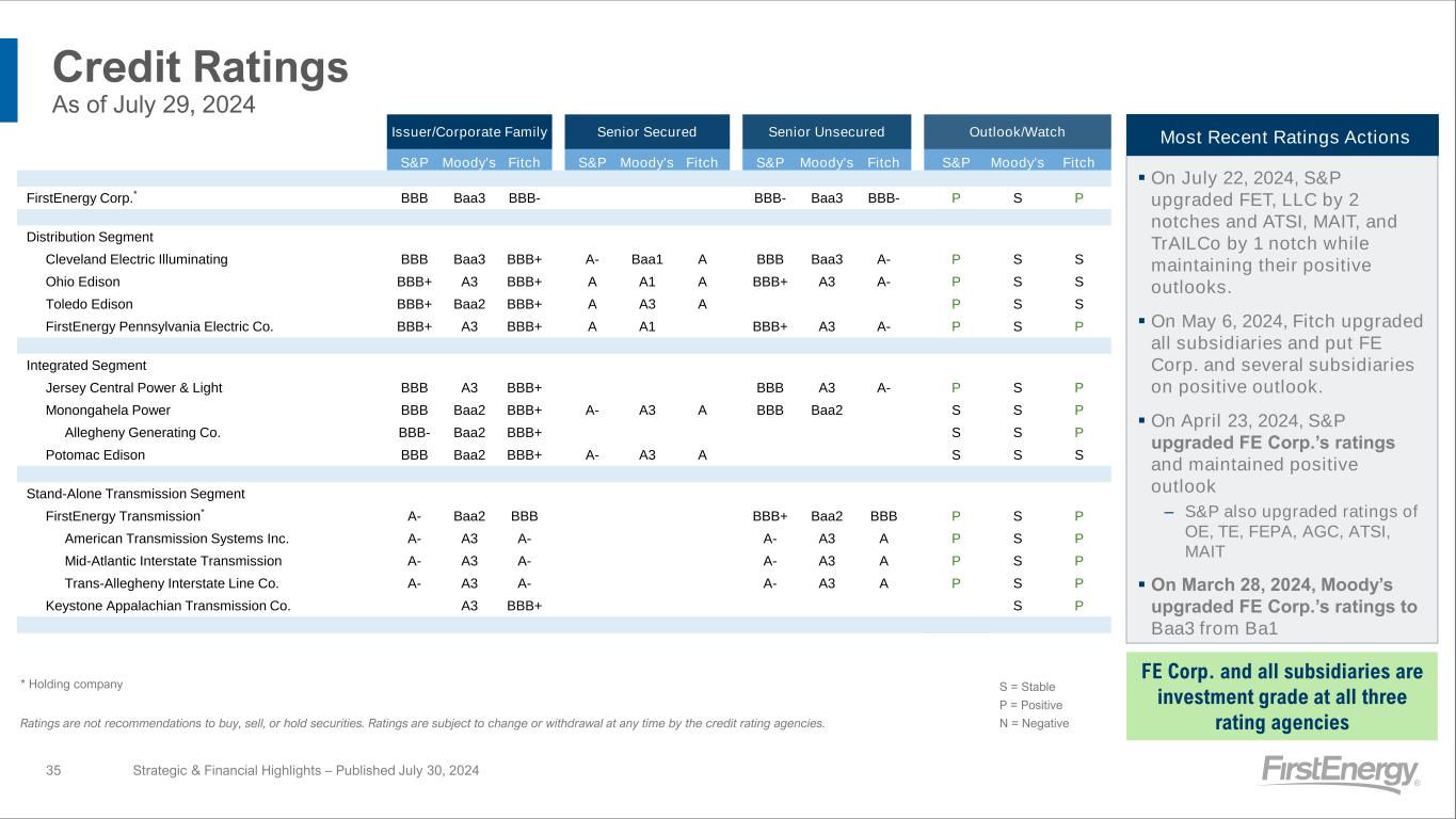 Weather Impacts 34 KWh Strategic & Financial Highlights – Published July 30, 2024 0 100 200 300 400 500 1,400 1,150 900 650 400 150 Apr-23 May-23 Jun-23 Jul-23 Aug-23 Sep-23 Oct-23 Nov-23 Dec-23 Jan-24 Feb-24 Mar-24 Apr-24 May-24 Jun-24 HDD CDD HDD Norm CDD Norm Total EPS Impact 2Q YTD Weather vs Normal: Weather vs Normal: $0.04 -$0.04 Weather vs 2023: Weather vs 2023: $0.08 $0.13 OH PA NJ WV MD Total Days % Days % Days % Days % Days % Days % 2Q24 vs Normal CDD 79 32% 118 46% 141 42% 67 25% 119 33% 104 37% HDD (202) -31% (172) -30% (61) -13% (142) -30% (117) -26% (154) -28% vs 2Q23 CDD 184 124% 235 170% 228 90% 235 226% 248 105% 217 131% HDD (192) -30% (149) -27% 57 16% (155) -32% (43) -12% (118) -23%