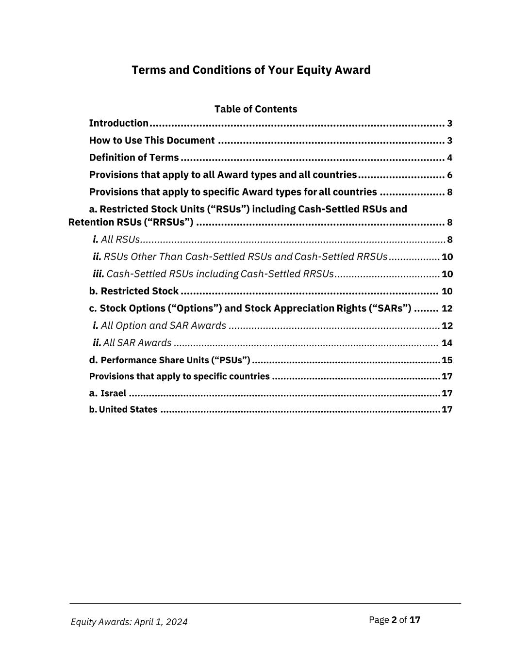 Equity Awards: April 1, 2024 Page 2 of 17 Terms and Conditions of Your Equity Award Table of Contents Introduction ............................................................................................... 3 How to Use This Document ......................................................................... 3 Definition of Terms ..................................................................................... 4 Provisions that apply to all Award types and all countries ............................ 6 Provisions that apply to specific Award types for all countries ..................... 8 a. Restricted Stock Units (“RSUs”) including Cash-Settled RSUs and Retention RSUs (“RRSUs”) ................................................................................ 8 i. All RSUs ........................................................................................................... 8 ii. RSUs Other Than Cash-Settled RSUs and Cash-Settled RRSUs .................. 10 iii. Cash-Settled RSUs including Cash-Settled RRSUs ..................................... 10 b. Restricted Stock ................................................................................... 10 c. Stock Options (“Options”) and Stock Appreciation Rights (“SARs”) ........ 12 i. All Option and SAR Awards .......................................................................... 12 ii. All SAR Awards ................................................................................................ 14 d. Performance Share Units (“PSUs”) .................................................................. 15 Provisions that apply to specific countries ........................................................... 17 a. Israel ............................................................................................................. 17 b. United States .................................................................................................. 17