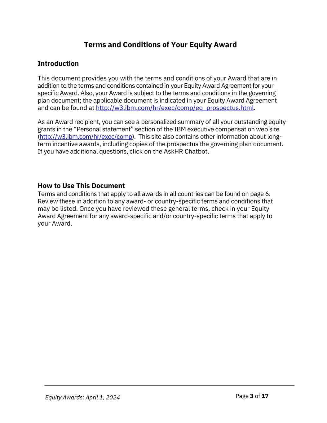 Equity Awards: April 1, 2024 Page 3 of 17 Terms and Conditions of Your Equity Award Introduction This document provides you with the terms and conditions of your Award that are in addition to the terms and conditions contained in your Equity Award Agreement for your specific Award. Also, your Award is subject to the terms and conditions in the governing plan document; the applicable document is indicated in your Equity Award Agreement and can be found at http://w3.ibm.com/hr/exec/comp/eq_prospectus.html. As an Award recipient, you can see a personalized summary of all your outstanding equity grants in the “Personal statement” section of the IBM executive compensation web site (http://w3.ibm.com/hr/exec/comp). This site also contains other information about long- term incentive awards, including copies of the prospectus the governing plan document. If you have additional questions, click on the AskHR Chatbot. How to Use This Document Terms and conditions that apply to all awards in all countries can be found on page 6. Review these in addition to any award- or country-specific terms and conditions that may be listed. Once you have reviewed these general terms, check in your Equity Award Agreement for any award-specific and/or country-specific terms that apply to your Award.