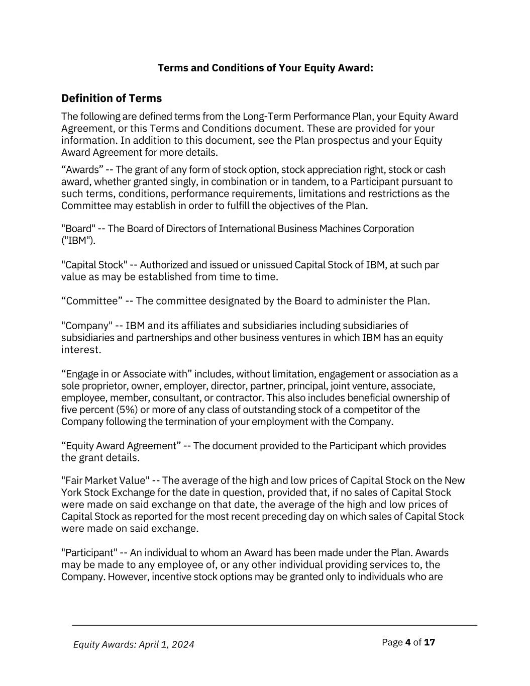 Equity Awards: April 1, 2024 Page 4 of 17 Terms and Conditions of Your Equity Award: Definition of Terms The following are defined terms from the Long-Term Performance Plan, your Equity Award Agreement, or this Terms and Conditions document. These are provided for your information. In addition to this document, see the Plan prospectus and your Equity Award Agreement for more details. “Awards” -- The grant of any form of stock option, stock appreciation right, stock or cash award, whether granted singly, in combination or in tandem, to a Participant pursuant to such terms, conditions, performance requirements, limitations and restrictions as the Committee may establish in order to fulfill the objectives of the Plan. "Board" -- The Board of Directors of International Business Machines Corporation ("IBM"). "Capital Stock" -- Authorized and issued or unissued Capital Stock of IBM, at such par value as may be established from time to time. “Committee” -- The committee designated by the Board to administer the Plan. "Company" -- IBM and its affiliates and subsidiaries including subsidiaries of subsidiaries and partnerships and other business ventures in which IBM has an equity interest. “Engage in or Associate with” includes, without limitation, engagement or association as a sole proprietor, owner, employer, director, partner, principal, joint venture, associate, employee, member, consultant, or contractor. This also includes beneficial ownership of five percent (5%) or more of any class of outstanding stock of a competitor of the Company following the termination of your employment with the Company. “Equity Award Agreement” -- The document provided to the Participant which provides the grant details. "Fair Market Value" -- The average of the high and low prices of Capital Stock on the New York Stock Exchange for the date in question, provided that, if no sales of Capital Stock were made on said exchange on that date, the average of the high and low prices of Capital Stock as reported for the most recent preceding day on which sales of Capital Stock were made on said exchange. "Participant" -- An individual to whom an Award has been made under the Plan. Awards may be made to any employee of, or any other individual providing services to, the Company. However, incentive stock options may be granted only to individuals who are