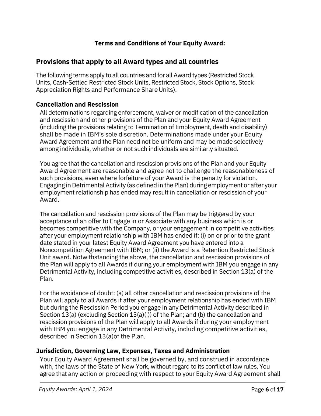 Equity Awards: April 1, 2024 Page 6 of 17 Terms and Conditions of Your Equity Award: Provisions that apply to all Award types and all countries The following terms apply to all countries and for all Award types (Restricted Stock Units, Cash-Settled Restricted Stock Units, Restricted Stock, Stock Options, Stock Appreciation Rights and Performance Share Units). Cancellation and Rescission All determinations regarding enforcement, waiver or modification of the cancellation and rescission and other provisions of the Plan and your Equity Award Agreement (including the provisions relating to Termination of Employment, death and disability) shall be made in IBM’s sole discretion. Determinations made under your Equity Award Agreement and the Plan need not be uniform and may be made selectively among individuals, whether or not such individuals are similarly situated. You agree that the cancellation and rescission provisions of the Plan and your Equity Award Agreement are reasonable and agree not to challenge the reasonableness of such provisions, even where forfeiture of your Award is the penalty for violation. Engaging in Detrimental Activity (as defined in the Plan) during employment or after your employment relationship has ended may result in cancellation or rescission of your Award. The cancellation and rescission provisions of the Plan may be triggered by your acceptance of an offer to Engage in or Associate with any business which is or becomes competitive with the Company, or your engagement in competitive activities after your employment relationship with IBM has ended if: (i) on or prior to the grant date stated in your latest Equity Award Agreement you have entered into a Noncompetition Agreement with IBM; or (ii) the Award is a Retention Restricted Stock Unit award. Notwithstanding the above, the cancellation and rescission provisions of the Plan will apply to all Awards if during your employment with IBM you engage in any Detrimental Activity, including competitive activities, described in Section 13(a) of the Plan. For the avoidance of doubt: (a) all other cancellation and rescission provisions of the Plan will apply to all Awards if after your employment relationship has ended with IBM but during the Rescission Period you engage in any Detrimental Activity described in Section 13(a) (excluding Section 13(a)(i)) of the Plan; and (b) the cancellation and rescission provisions of the Plan will apply to all Awards if during your employment with IBM you engage in any Detrimental Activity, including competitive activities, described in Section 13(a)of the Plan. Jurisdiction, Governing Law, Expenses, Taxes and Administration Your Equity Award Agreement shall be governed by, and construed in accordance with, the laws of the State of New York, without regard to its conflict of law rules. You agree that any action or proceeding with respect to your Equity Award Agreement shall