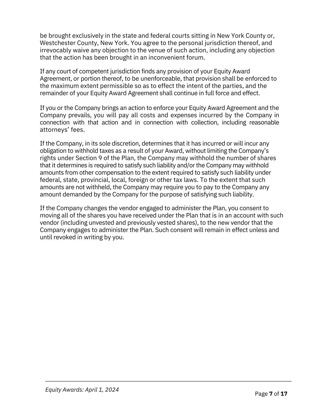 Equity Awards: April 1, 2024 Page 7 of 17 be brought exclusively in the state and federal courts sitting in New York County or, Westchester County, New York. You agree to the personal jurisdiction thereof, and irrevocably waive any objection to the venue of such action, including any objection that the action has been brought in an inconvenient forum. If any court of competent jurisdiction finds any provision of your Equity Award Agreement, or portion thereof, to be unenforceable, that provision shall be enforced to the maximum extent permissible so as to effect the intent of the parties, and the remainder of your Equity Award Agreement shall continue in full force and effect. If you or the Company brings an action to enforce your Equity Award Agreement and the Company prevails, you will pay all costs and expenses incurred by the Company in connection with that action and in connection with collection, including reasonable attorneys’ fees. If the Company, in its sole discretion, determines that it has incurred or will incur any obligation to withhold taxes as a result of your Award, without limiting the Company’s rights under Section 9 of the Plan, the Company may withhold the number of shares that it determines is required to satisfy such liability and/or the Company may withhold amounts from other compensation to the extent required to satisfy such liability under federal, state, provincial, local, foreign or other tax laws. To the extent that such amounts are not withheld, the Company may require you to pay to the Company any amount demanded by the Company for the purpose of satisfying such liability. If the Company changes the vendor engaged to administer the Plan, you consent to moving all of the shares you have received under the Plan that is in an account with such vendor (including unvested and previously vested shares), to the new vendor that the Company engages to administer the Plan. Such consent will remain in effect unless and until revoked in writing by you.