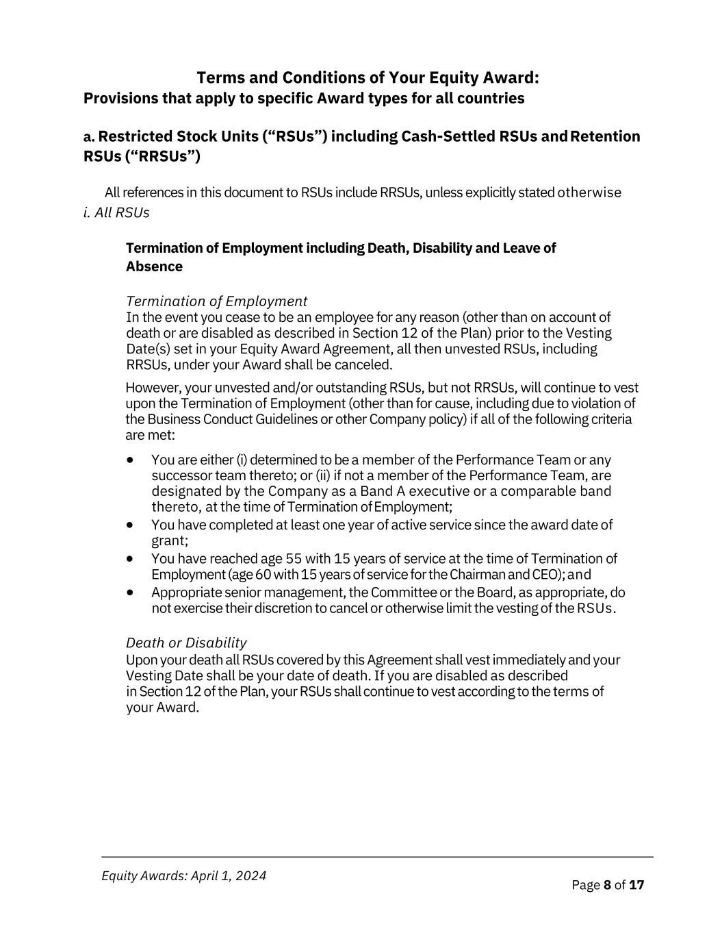 Equity Awards: April 1, 2024 Page 8 of 17 Terms and Conditions of Your Equity Award: Provisions that apply to specific Award types for all countries a. Restricted Stock Units (“RSUs”) including Cash-Settled RSUs and Retention RSUs (“RRSUs”) All references in this document to RSUs include RRSUs, unless explicitly stated otherwise i. All RSUs Termination of Employment including Death, Disability and Leave of Absence Termination of Employment In the event you cease to be an employee for any reason (other than on account of death or are disabled as described in Section 12 of the Plan) prior to the Vesting Date(s) set in your Equity Award Agreement, all then unvested RSUs, including RRSUs, under your Award shall be canceled. However, your unvested and/or outstanding RSUs, but not RRSUs, will continue to vest upon the Termination of Employment (other than for cause, including due to violation of the Business Conduct Guidelines or other Company policy) if all of the following criteria are met: You are either (i) determined to be a member of the Performance Team or any successor team thereto; or (ii) if not a member of the Performance Team, are designated by the Company as a Band A executive or a comparable band thereto, at the time of Termination of Employment; You have completed at least one year of active service since the award date of grant; You have reached age 55 with 15 years of service at the time of Termination of Employment (age 60 with 15 years of service for the Chairman and CEO); and Appropriate senior management, the Committee or the Board, as appropriate, do not exercise their discretion to cancel or otherwise limit the vesting of the RSUs. Death or Disability Upon your death all RSUs covered by this Agreement shall vest immediately and your Vesting Date shall be your date of death. If you are disabled as described in Section 12 of the Plan, your RSUs shall continue to vest according to the terms of your Award.