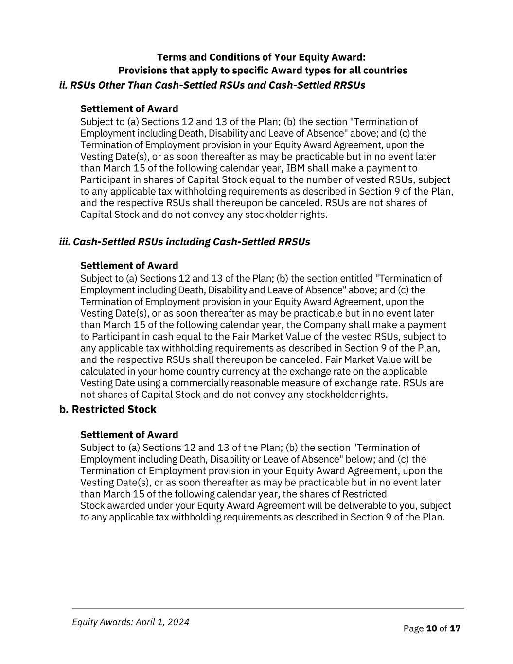 Equity Awards: April 1, 2024 Page 10 of 17 Terms and Conditions of Your Equity Award: Provisions that apply to specific Award types for all countries ii. RSUs Other Than Cash-Settled RSUs and Cash-Settled RRSUs Settlement of Award Subject to (a) Sections 12 and 13 of the Plan; (b) the section "Termination of Employment including Death, Disability and Leave of Absence" above; and (c) the Termination of Employment provision in your Equity Award Agreement, upon the Vesting Date(s), or as soon thereafter as may be practicable but in no event later than March 15 of the following calendar year, IBM shall make a payment to Participant in shares of Capital Stock equal to the number of vested RSUs, subject to any applicable tax withholding requirements as described in Section 9 of the Plan, and the respective RSUs shall thereupon be canceled. RSUs are not shares of Capital Stock and do not convey any stockholder rights. iii. Cash-Settled RSUs including Cash-Settled RRSUs Settlement of Award Subject to (a) Sections 12 and 13 of the Plan; (b) the section entitled "Termination of Employment including Death, Disability and Leave of Absence" above; and (c) the Termination of Employment provision in your Equity Award Agreement, upon the Vesting Date(s), or as soon thereafter as may be practicable but in no event later than March 15 of the following calendar year, the Company shall make a payment to Participant in cash equal to the Fair Market Value of the vested RSUs, subject to any applicable tax withholding requirements as described in Section 9 of the Plan, and the respective RSUs shall thereupon be canceled. Fair Market Value will be calculated in your home country currency at the exchange rate on the applicable Vesting Date using a commercially reasonable measure of exchange rate. RSUs are not shares of Capital Stock and do not convey any stockholder rights. b. Restricted Stock Settlement of Award Subject to (a) Sections 12 and 13 of the Plan; (b) the section "Termination of Employment including Death, Disability or Leave of Absence" below; and (c) the Termination of Employment provision in your Equity Award Agreement, upon the Vesting Date(s), or as soon thereafter as may be practicable but in no event later than March 15 of the following calendar year, the shares of Restricted Stock awarded under your Equity Award Agreement will be deliverable to you, subject to any applicable tax withholding requirements as described in Section 9 of the Plan.