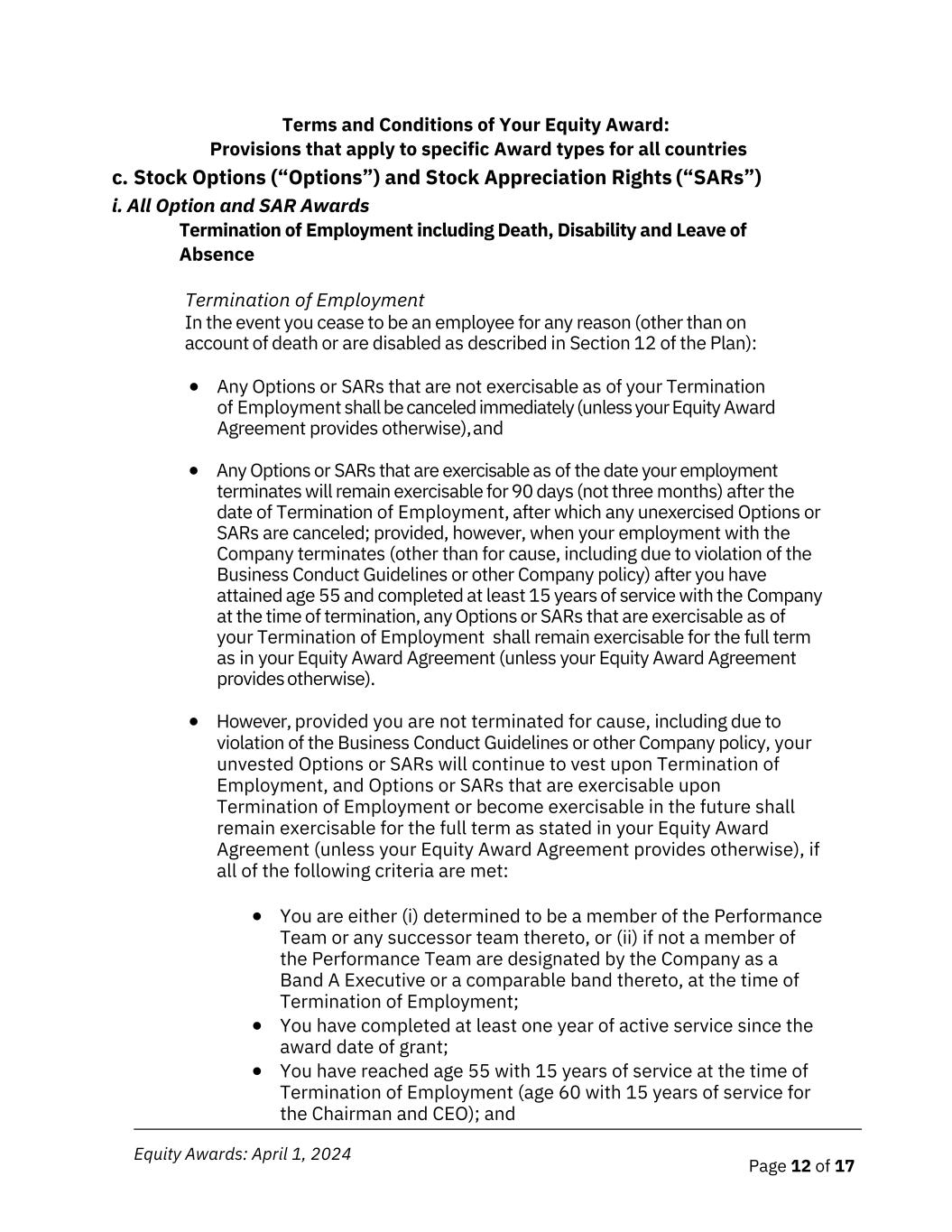 Equity Awards: April 1, 2024 Page 12 of 17 Terms and Conditions of Your Equity Award: Provisions that apply to specific Award types for all countries c. Stock Options (“Options”) and Stock Appreciation Rights (“SARs”) i. All Option and SAR Awards Termination of Employment including Death, Disability and Leave of Absence Termination of Employment In the event you cease to be an employee for any reason (other than on account of death or are disabled as described in Section 12 of the Plan): Any Options or SARs that are not exercisable as of your Termination of Employment shall be canceled immediately (unless your Equity Award Agreement provides otherwise), and Any Options or SARs that are exercisable as of the date your employment terminates will remain exercisable for 90 days (not three months) after the date of Termination of Employment, after which any unexercised Options or SARs are canceled; provided, however, when your employment with the Company terminates (other than for cause, including due to violation of the Business Conduct Guidelines or other Company policy) after you have attained age 55 and completed at least 15 years of service with the Company at the time of termination, any Options or SARs that are exercisable as of your Termination of Employment shall remain exercisable for the full term as in your Equity Award Agreement (unless your Equity Award Agreement provides otherwise). However, provided you are not terminated for cause, including due to violation of the Business Conduct Guidelines or other Company policy, your unvested Options or SARs will continue to vest upon Termination of Employment, and Options or SARs that are exercisable upon Termination of Employment or become exercisable in the future shall remain exercisable for the full term as stated in your Equity Award Agreement (unless your Equity Award Agreement provides otherwise), if all of the following criteria are met: You are either (i) determined to be a member of the Performance Team or any successor team thereto, or (ii) if not a member of the Performance Team are designated by the Company as a Band A Executive or a comparable band thereto, at the time of Termination of Employment; You have completed at least one year of active service since the award date of grant; You have reached age 55 with 15 years of service at the time of Termination of Employment (age 60 with 15 years of service for the Chairman and CEO); and