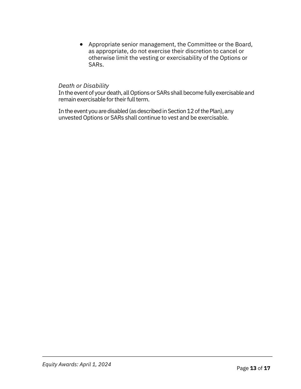 Equity Awards: April 1, 2024 Page 13 of 17 Appropriate senior management, the Committee or the Board, as appropriate, do not exercise their discretion to cancel or otherwise limit the vesting or exercisability of the Options or SARs. Death or Disability In the event of your death, all Options or SARs shall become fully exercisable and remain exercisable for their full term. In the event you are disabled (as described in Section 12 of the Plan), any unvested Options or SARs shall continue to vest and be exercisable.