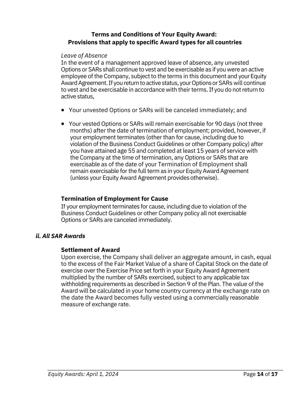 Equity Awards: April 1, 2024 Page 14 of 17 Terms and Conditions of Your Equity Award: Provisions that apply to specific Award types for all countries Leave of Absence In the event of a management approved leave of absence, any unvested Options or SARs shall continue to vest and be exercisable as if you were an active employee of the Company, subject to the terms in this document and your Equity Award Agreement. If you return to active status, your Options or SARs will continue to vest and be exercisable in accordance with their terms. If you do not return to active status, Your unvested Options or SARs will be canceled immediately; and Your vested Options or SARs will remain exercisable for 90 days (not three months) after the date of termination of employment; provided, however, if your employment terminates (other than for cause, including due to violation of the Business Conduct Guidelines or other Company policy) after you have attained age 55 and completed at least 15 years of service with the Company at the time of termination, any Options or SARs that are exercisable as of the date of your Termination of Employment shall remain exercisable for the full term as in your Equity Award Agreement (unless your Equity Award Agreement provides otherwise). Termination of Employment for Cause If your employment terminates for cause, including due to violation of the Business Conduct Guidelines or other Company policy all not exercisable Options or SARs are canceled immediately. ii. All SAR Awards Settlement of Award Upon exercise, the Company shall deliver an aggregate amount, in cash, equal to the excess of the Fair Market Value of a share of Capital Stock on the date of exercise over the Exercise Price set forth in your Equity Award Agreement multiplied by the number of SARs exercised, subject to any applicable tax withholding requirements as described in Section 9 of the Plan. The value of the Award will be calculated in your home country currency at the exchange rate on the date the Award becomes fully vested using a commercially reasonable measure of exchange rate.