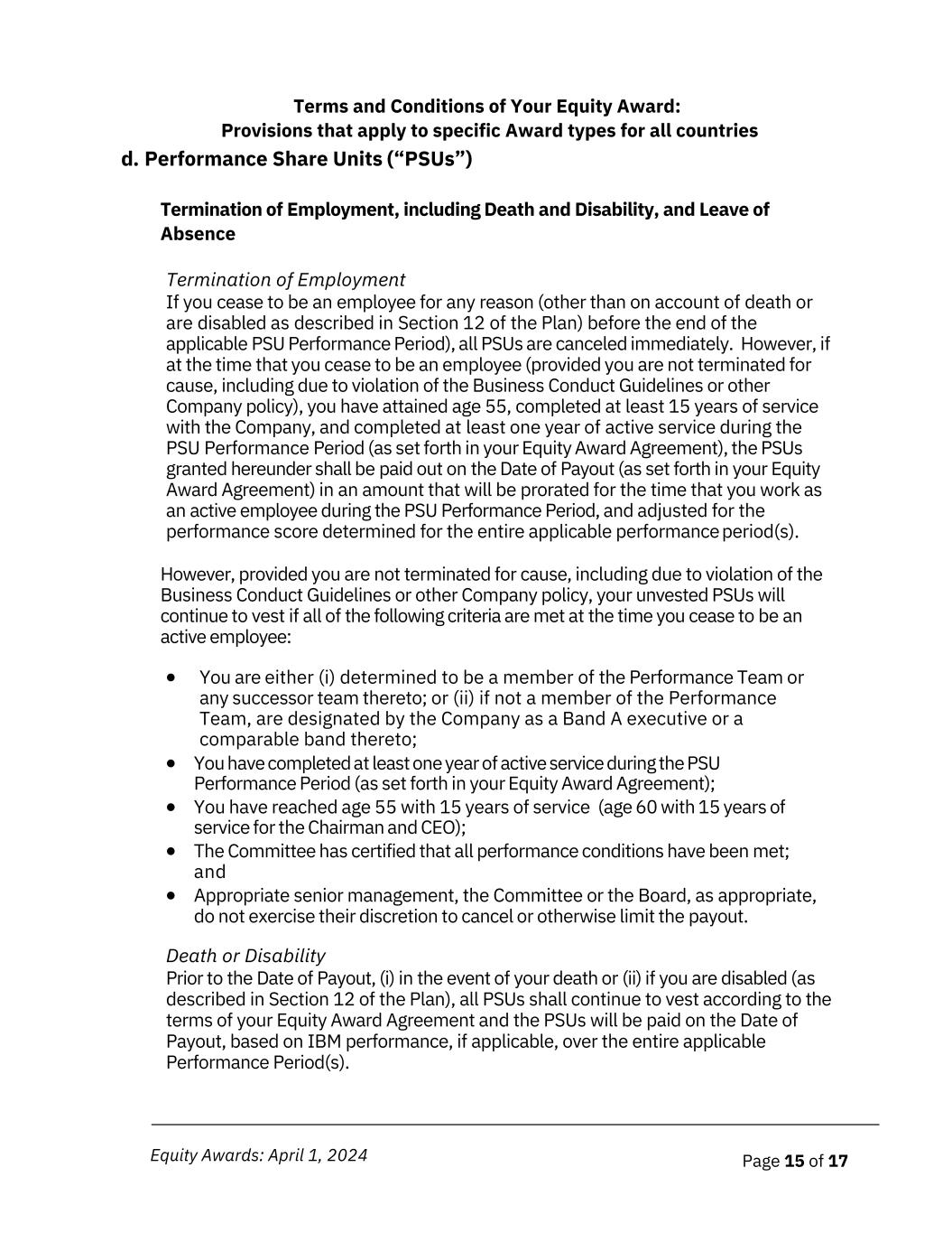 Equity Awards: April 1, 2024 Page 15 of 17 Terms and Conditions of Your Equity Award: Provisions that apply to specific Award types for all countries d. Performance Share Units (“PSUs”) Termination of Employment, including Death and Disability, and Leave of Absence Termination of Employment If you cease to be an employee for any reason (other than on account of death or are disabled as described in Section 12 of the Plan) before the end of the applicable PSU Performance Period), all PSUs are canceled immediately. However, if at the time that you cease to be an employee (provided you are not terminated for cause, including due to violation of the Business Conduct Guidelines or other Company policy), you have attained age 55, completed at least 15 years of service with the Company, and completed at least one year of active service during the PSU Performance Period (as set forth in your Equity Award Agreement), the PSUs granted hereunder shall be paid out on the Date of Payout (as set forth in your Equity Award Agreement) in an amount that will be prorated for the time that you work as an active employee during the PSU Performance Period, and adjusted for the performance score determined for the entire applicable performance period(s). However, provided you are not terminated for cause, including due to violation of the Business Conduct Guidelines or other Company policy, your unvested PSUs will continue to vest if all of the following criteria are met at the time you cease to be an active employee: You are either (i) determined to be a member of the Performance Team or any successor team thereto; or (ii) if not a member of the Performance Team, are designated by the Company as a Band A executive or a comparable band thereto; You have completed at least one year of active service during the PSU Performance Period (as set forth in your Equity Award Agreement); You have reached age 55 with 15 years of service (age 60 with 15 years of service for the Chairman and CEO); The Committee has certified that all performance conditions have been met; and Appropriate senior management, the Committee or the Board, as appropriate, do not exercise their discretion to cancel or otherwise limit the payout. Death or Disability Prior to the Date of Payout, (i) in the event of your death or (ii) if you are disabled (as described in Section 12 of the Plan), all PSUs shall continue to vest according to the terms of your Equity Award Agreement and the PSUs will be paid on the Date of Payout, based on IBM performance, if applicable, over the entire applicable Performance Period(s).
