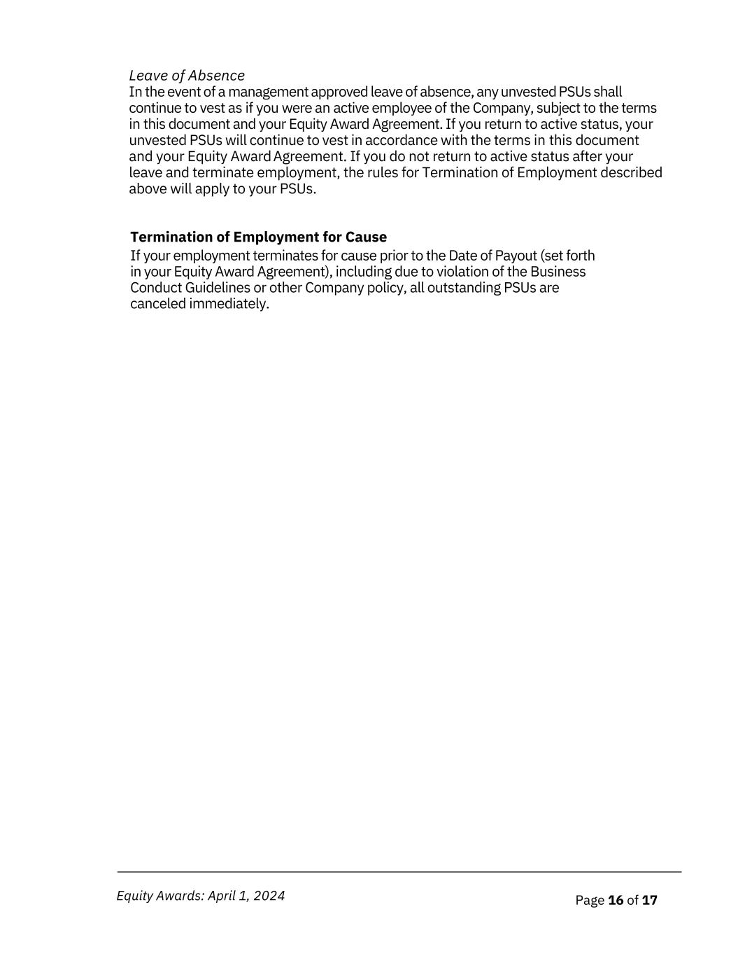 Equity Awards: April 1, 2024 Page 16 of 17 Leave of Absence In the event of a management approved leave of absence, any unvested PSUs shall continue to vest as if you were an active employee of the Company, subject to the terms in this document and your Equity Award Agreement. If you return to active status, your unvested PSUs will continue to vest in accordance with the terms in this document and your Equity Award Agreement. If you do not return to active status after your leave and terminate employment, the rules for Termination of Employment described above will apply to your PSUs. Termination of Employment for Cause If your employment terminates for cause prior to the Date of Payout (set forth in your Equity Award Agreement), including due to violation of the Business Conduct Guidelines or other Company policy, all outstanding PSUs are canceled immediately.